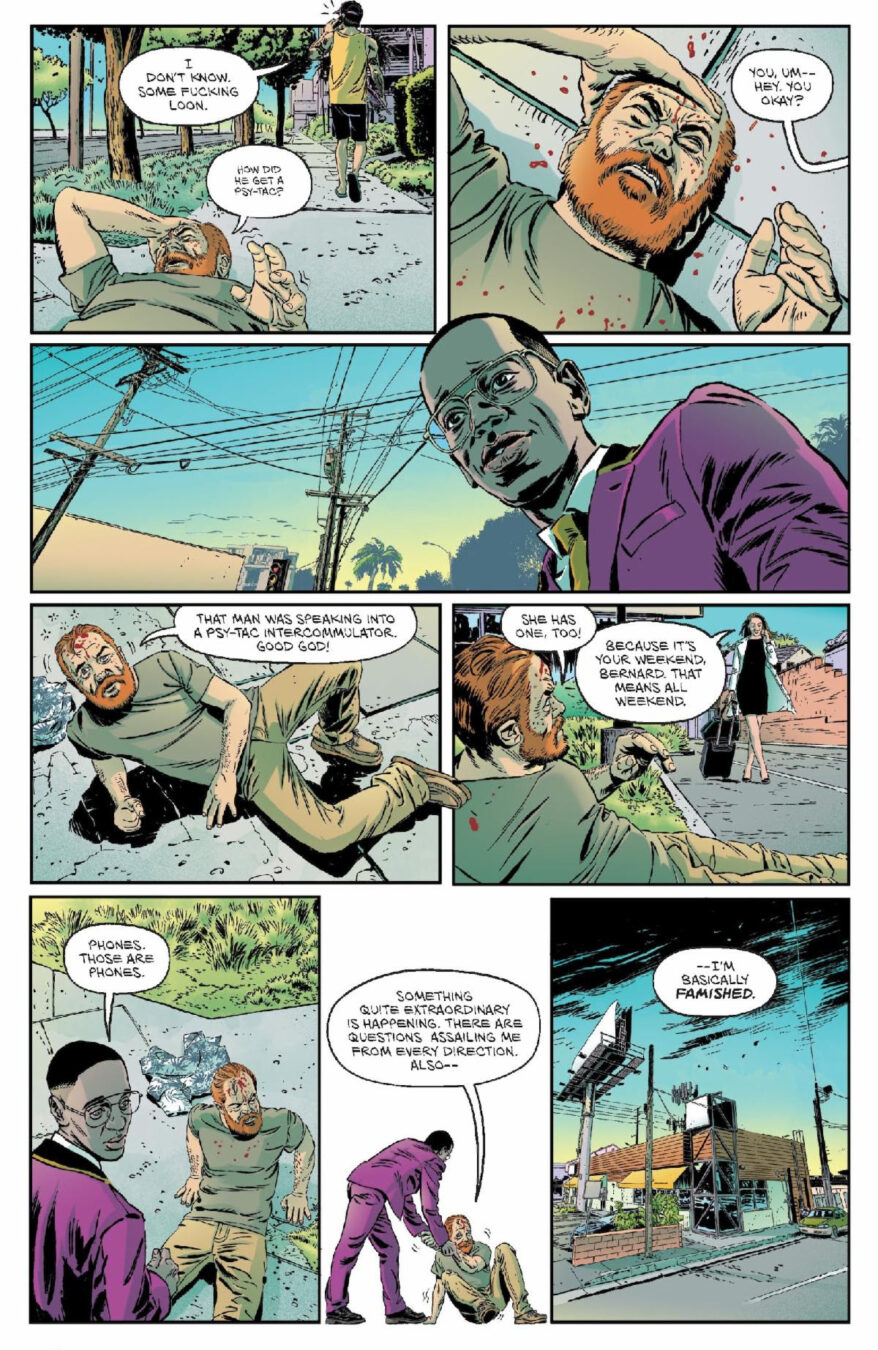 “In this sequence from early in the first issue of BENJAMIN, our cranky, hyperarticulate, cult sci-fi author hero Benjamin J. Carp has just been kicked out of the motel room where he woke up,” said Ben H. Winters. “The motel manager (quite reasonably) thinks he’s some sort of drunk or squatter, but Carp has no memories at all of how he got there, or anywhere, since he died back in 1982. Out on the street he is astonished at the strange new world (which he thinks has ripped him off) and is rescued by this sweet earnest young man named Marcus, who works at the motel.”