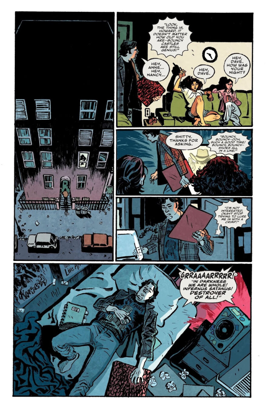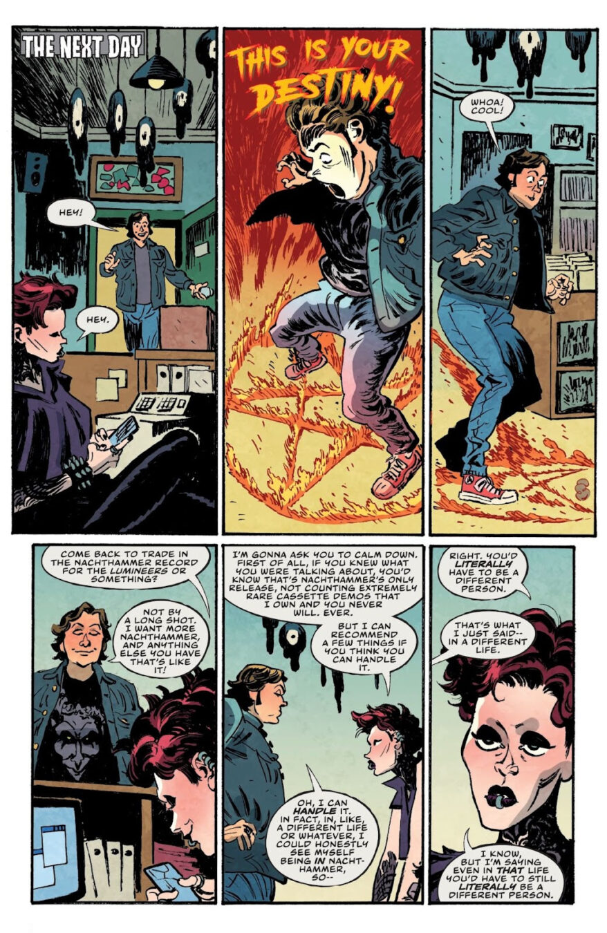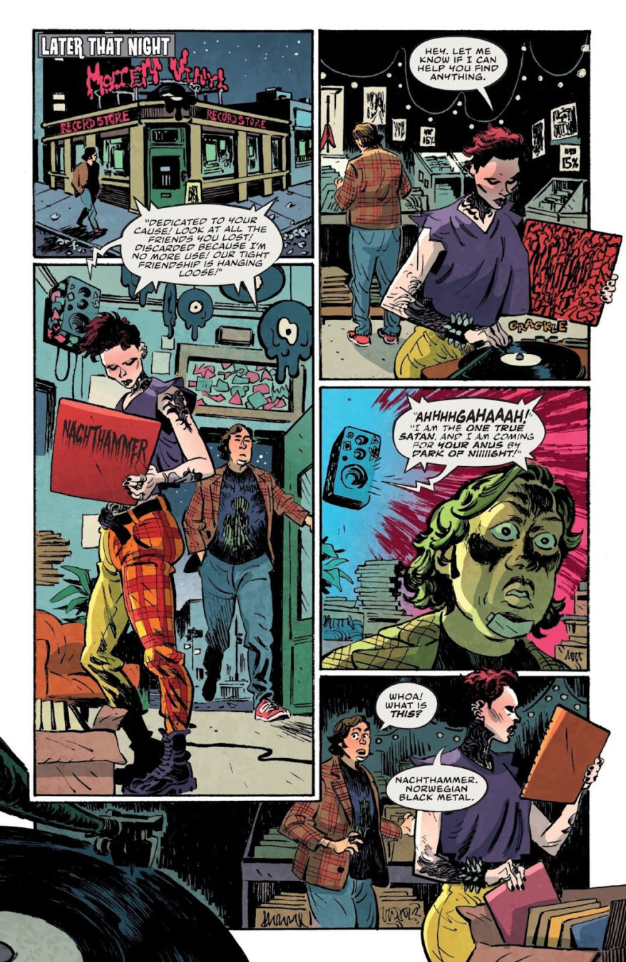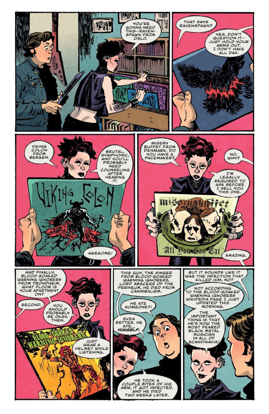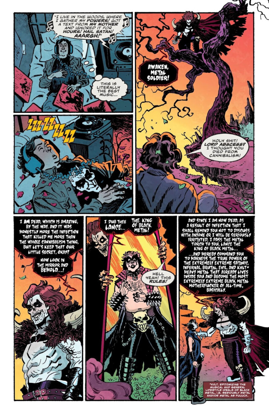 Oni Press – the multiple Eisner and Harvey award-winning publisher of groundbreaking comic books and graphic novels since 1997– is proud to present the first look inside DARK REGARDS #1, the SHOCKINGLY TRUE, TERRIFYINGLY HILARIOUS, AND ONLY MODESTLY EXAGGERATED tale torn from the mind of multi-hyphenate writer-comedian-actor-musician Dave Hill (Tasteful Nudes) and breakout artist Artyom Topilin (Cruel Universe, I Hate This Place)! Within these demonically cursed and never-before-seen pages, explore how one stand-up comedian forged a secret online identity as America’s first true black metal icon . . . and accidentally touched off an international trail of mayhem that included kidnappings, attempted human sacrifice, and the vandalizing of the last freestanding Bob’s Big Boy restaurant in the Midwest. Curious? We know you are. After all, this story is true. (For real!)