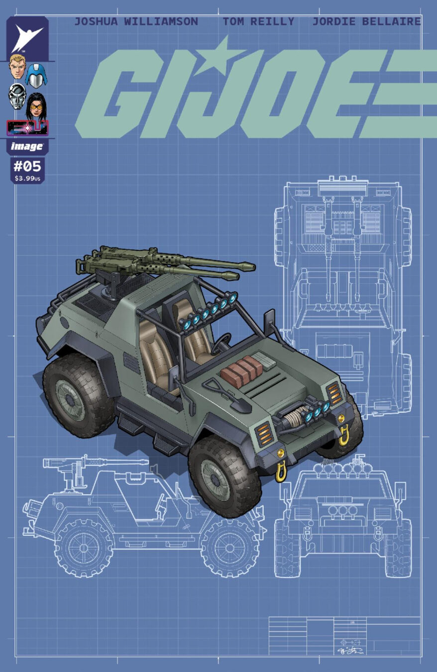 In addition to the main cover by Reilly, G.I. JOE #5 will feature an open-to-order variant cover by David Finch, Sandra Hope & Adriano Lucas; an open-to-order variant cover by Ryan Sook; the kickoff of a new 1:10 incentive connecting cover series by Karl Kerschl; a 1:25 incentive variant by Travis Moore & Adriano Lucas; and a 1:50 incentive variant by E.J. Su.