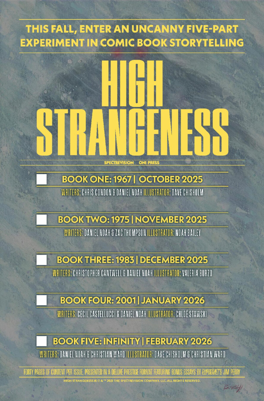 Plus: In stores now, follow the footsteps back to the beginning with the HIGH STRANGENESS: BOOK ONE SECOND PRINTING – an all-new edition of the saga’s stunning first chapter from SpectreVision co-founder Daniel Noah alongside acclaimed writer Chris Condon (Ultimate Wolverine) and Ringo Award winner Dave Chisholm (Plague House)!
