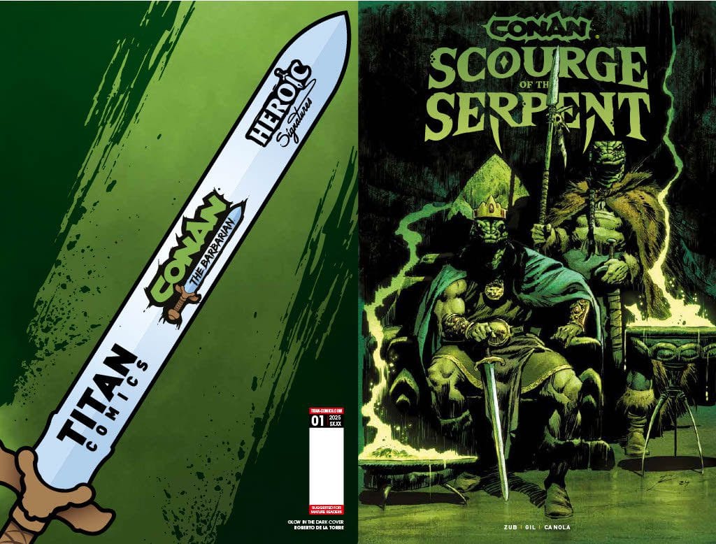 Titan Comics and Heroic Signatures are pleased to reveal the first look at the lettered pages of CONAN THE BARBARIAN: SCOURGE OF THE SERPENT #1 – spinning out of the pages of this year’s Free Comic Book Day Special – written by Jim Zub with art by Ivan Gil!