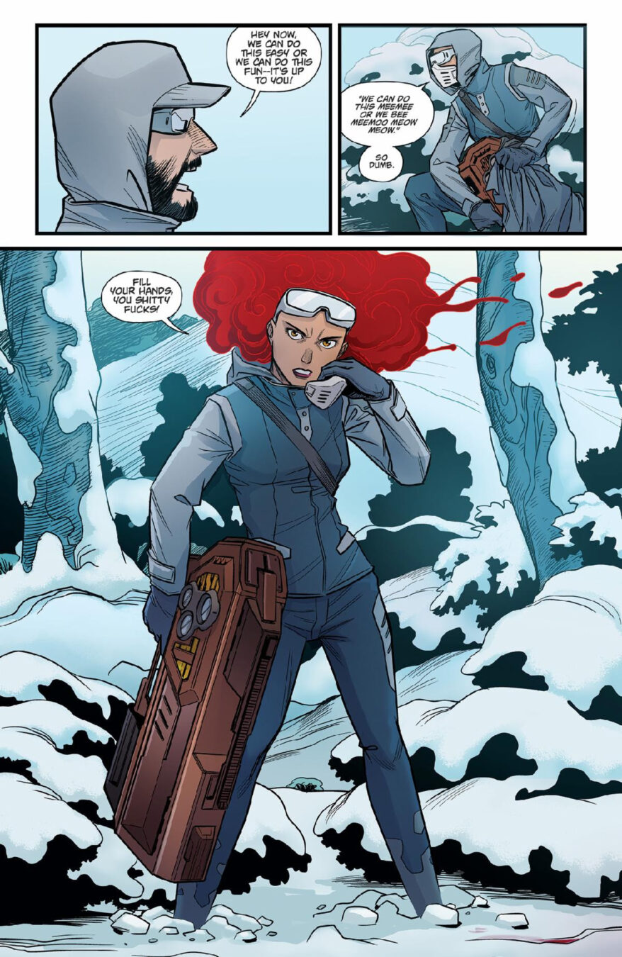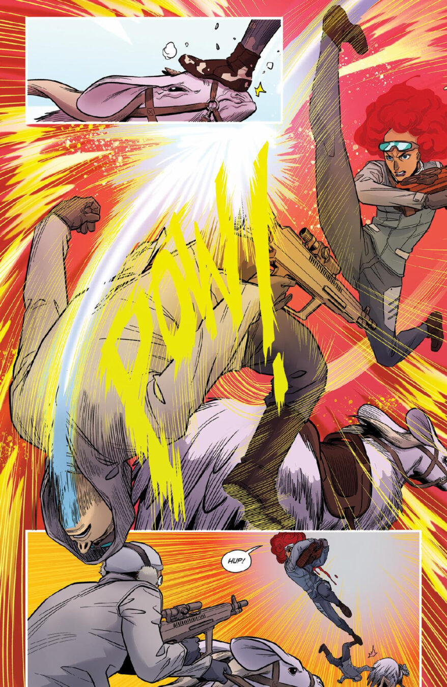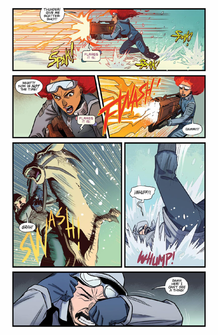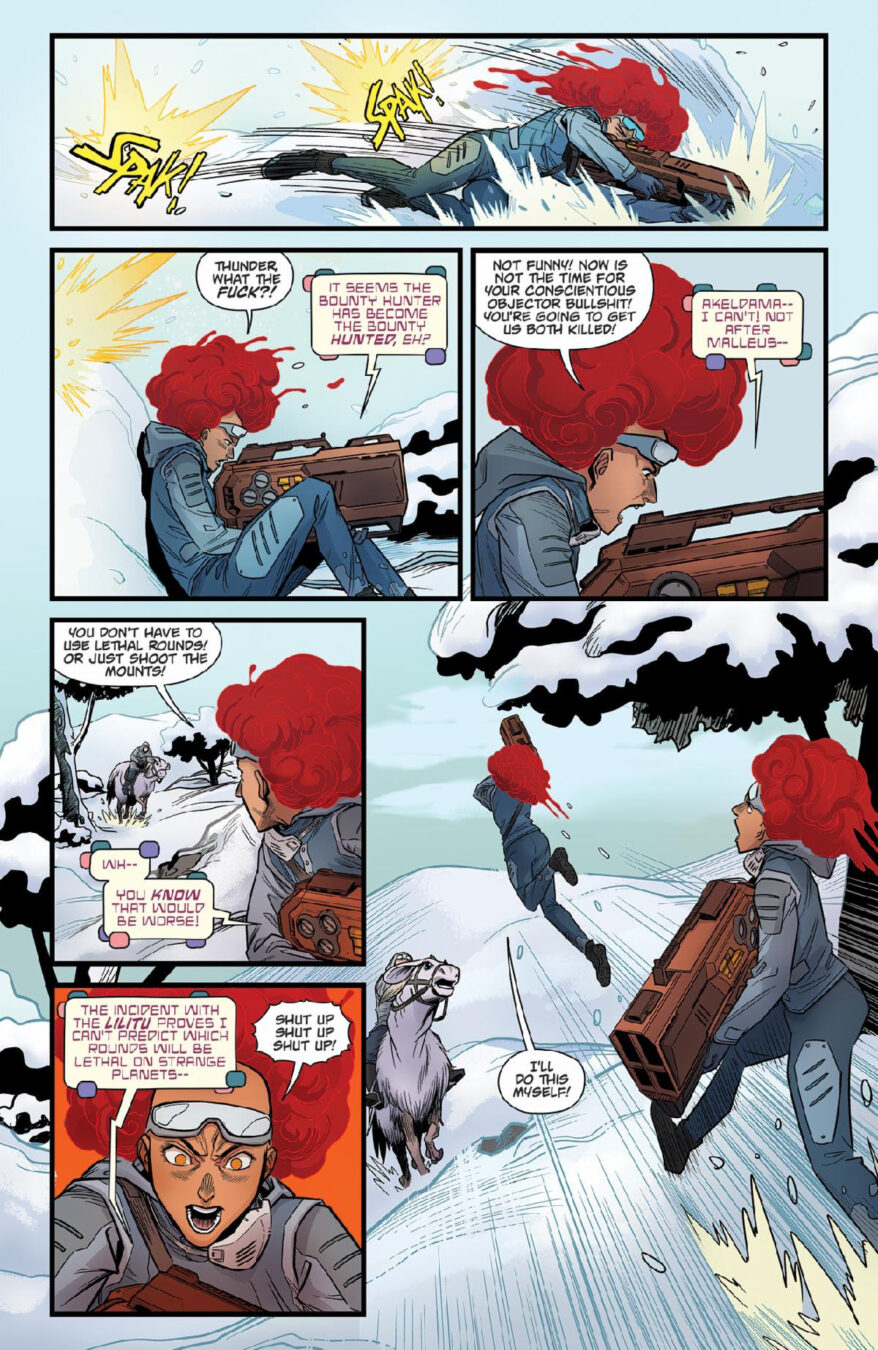 “Blood literally kicked the door down and started sprinting in issue #1,” said senior editor Nachie Marsham. “This second arc shakes up the people we’ve met and places we’ve been, while giving Blood problems that even Thunder can’t shoot his way through. And E.J. and MSassyK are lighting up the page every month with their art.”