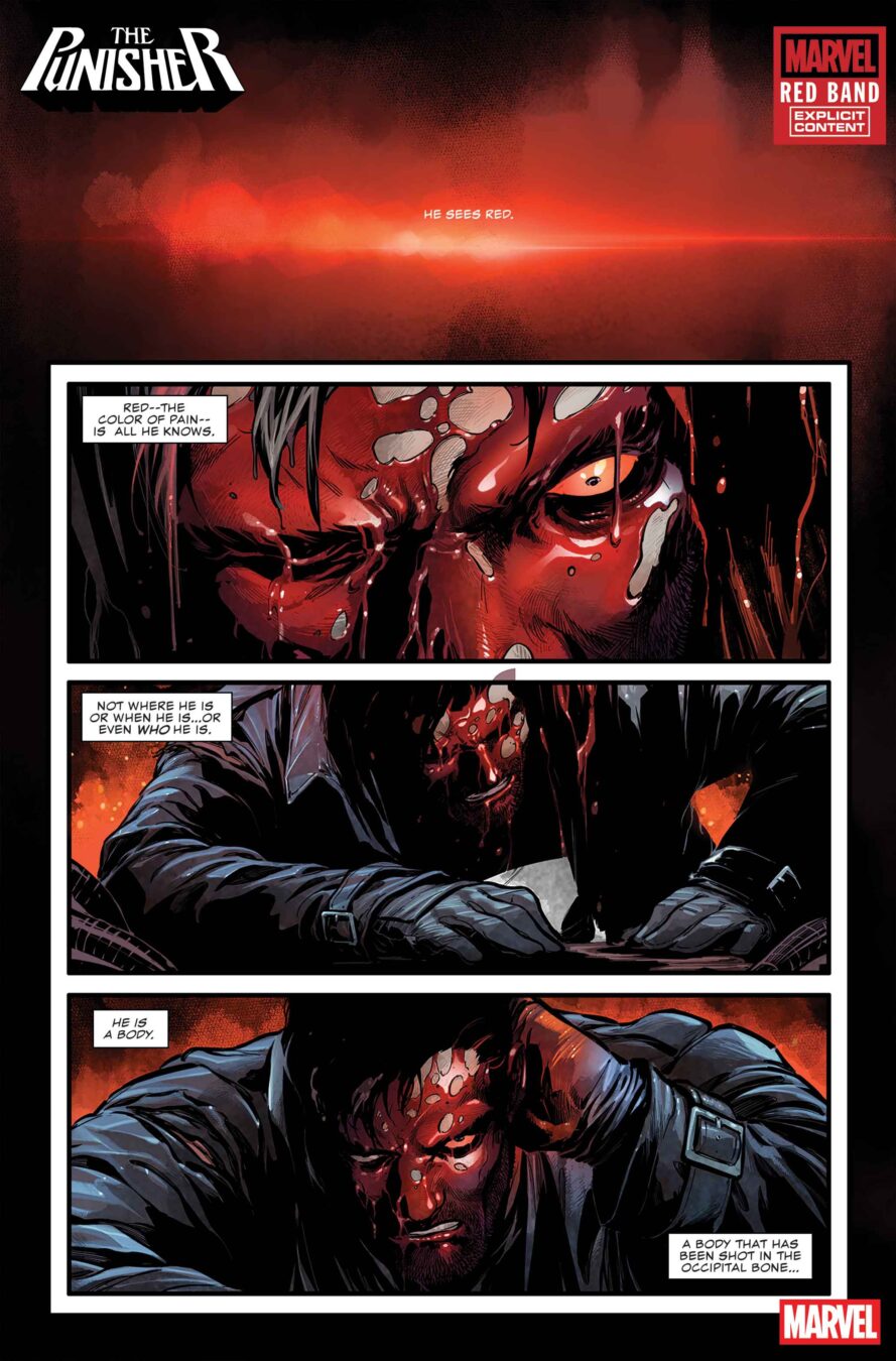 Reread and reload, True Believers – Frank Castle is BACK. With no memories, a full clip and a thirst for wrathful vengeance, his violent search for answers could only be chronicled in a Red Band series! Bullets will fly, blood will flow, and the citizens and criminals of New York City alike will fear the name THE PUNISHER!