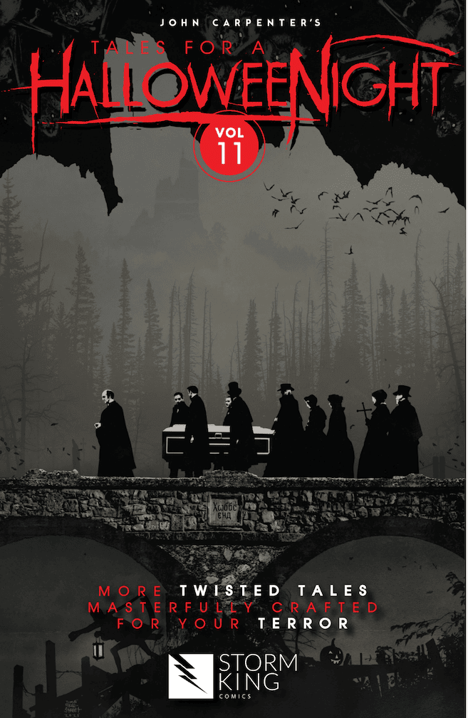 JOHN CARPENTER’S TALES FOR A HALLOWEENIGHT VOL. 11 wil be available in comics shops (findyourcomicstore.com) and from Storm King Comics (www.StormKingComics.com) on October 13. The newest horror anthology will also be available at Amazon, Barnes & Noble, Books-A-Million, and local bookstores (bookshop.org). Digital copies can be purchased from Global Comix.