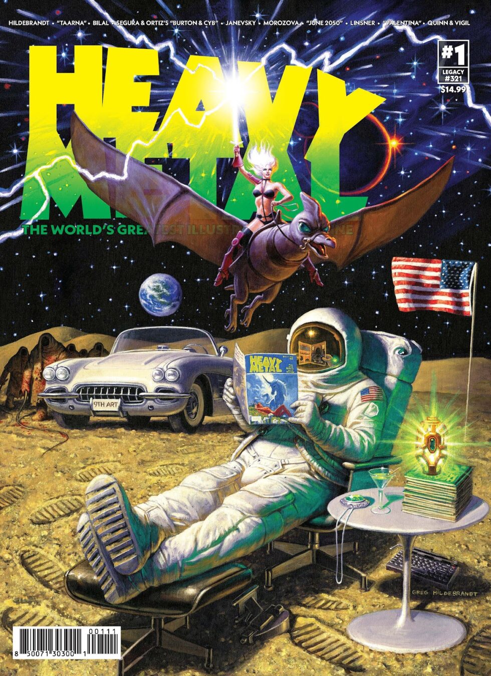 After its enormously successful Kickstarter campaign last year, Heavy Metal Magazine has officially relaunched with its brand new Issue #1 (Legacy #321) out now. Featuring a monumental 232 pages of mind-bending visuals and boundary-pushing content from both returning legends and breakout creators from around the globe, the debut issue marks a bold return to the magazine’s roots as the definitive illustrated anthology. Heavy Metal #1 is available for purchase today (via Diamond) and May 7 (via Lunar) in local comic shops, with the sci-fi, fantasy, and horror magazine hitting newsstands in the US, Canada, the UK, Australia, and many other countries worldwide starting May 13.
