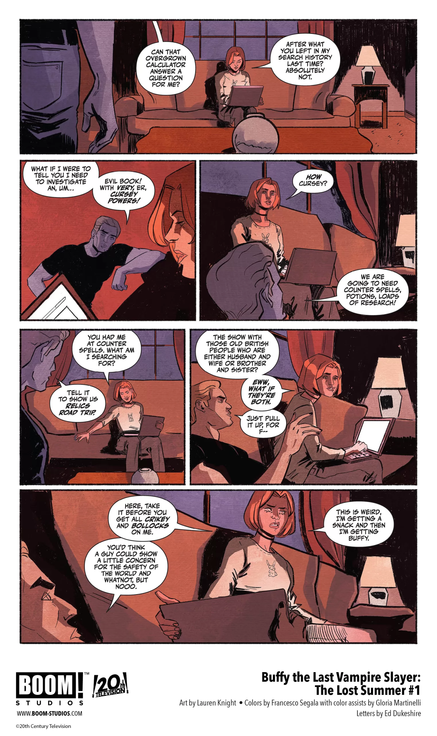 BOOM! Studios revealed today a first look at BUFFY THE VAMPIRE SLAYER: THE LOST SUMMER #1, the special issue one-Shot! Buffy the Last Vampire Slayer writer Casey Gilly, along with artist Lauren Knight (Golden Rage, Time Before Time), colorist Francesco Segala (Firefly, House of Slaughter) with color assists by Gloria Martinelli, and letterer Ed Dukeshire bring fans a frightfully fun story set in the continuity of the cult classic TV series, available in May 2023.