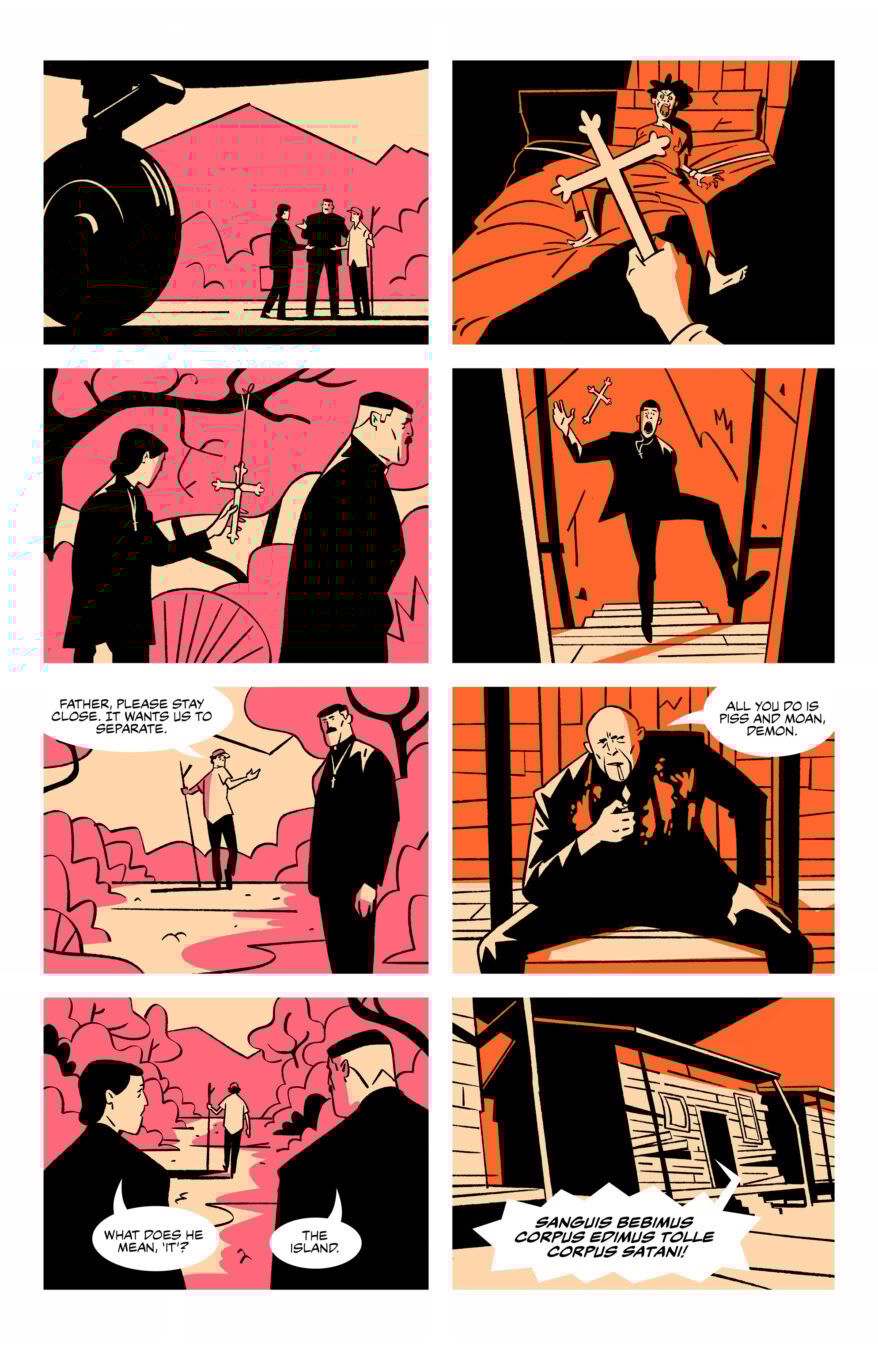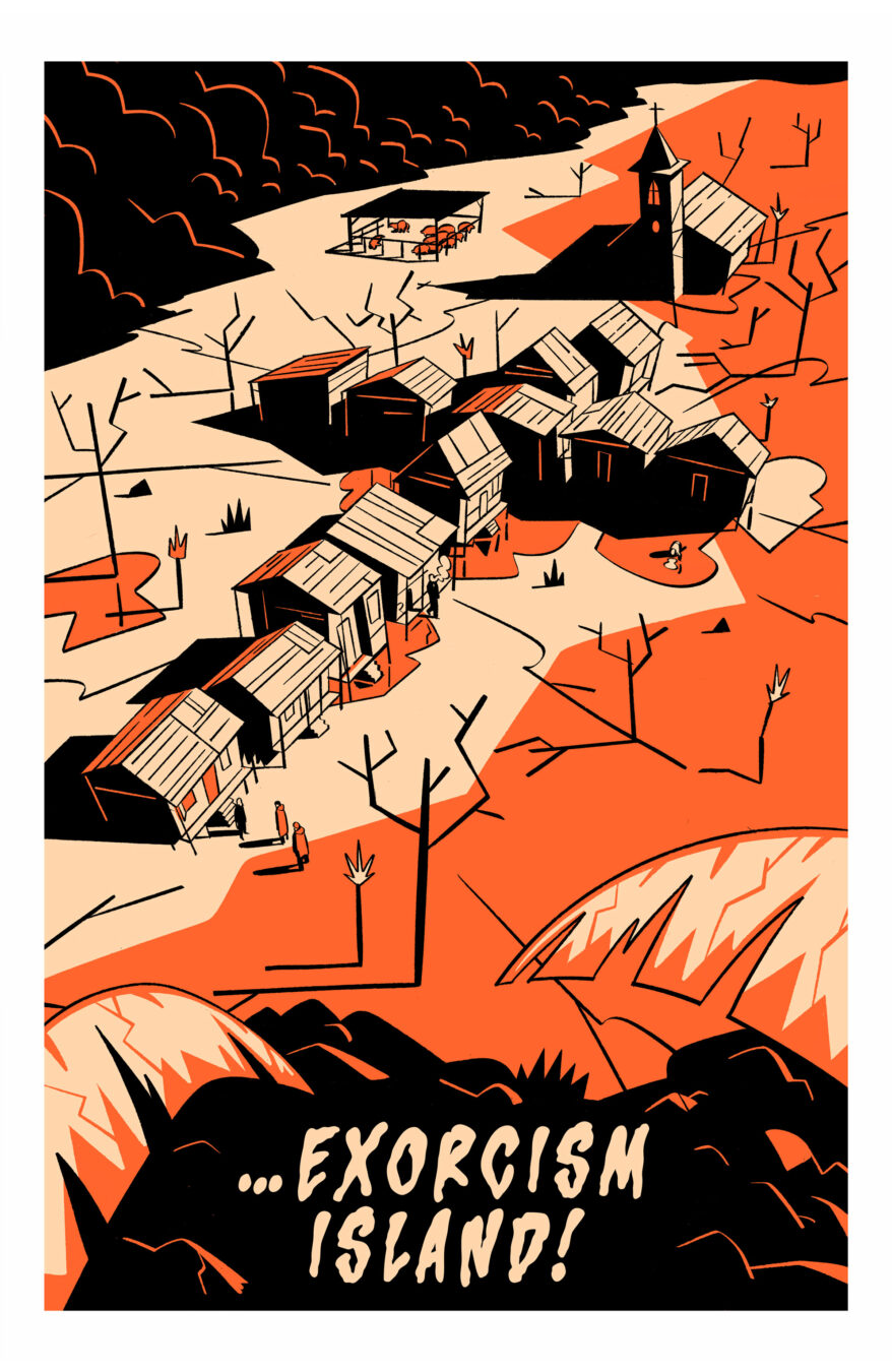 “Exorcism Island takes the tradition of the best demonic possession stories and cranks it up several notches with ever-escalating terror and tense cliffhangers,” says Jordan Thomas, the acclaimed writer of The Man From Maybe and Skin Police. “This is a story that is both horrifying and highly entertaining. And Chris brings it all together with his unique and visually gripping graphic art style and color choices.”