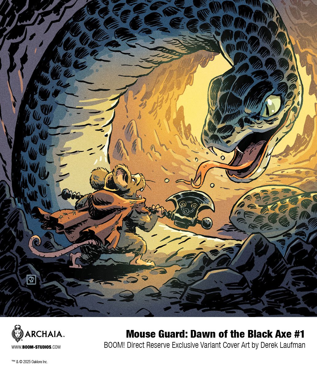 MOUSE GUARD: DAWN OF THE BLACK AXE #1 features main cover art by series artist Gabriel Rodríguez, and variant covers by David Petersen, celebrated artist Goñi Montes (Mighty Morphin Power Rangers), and a limited BOOM! Studios Direct Reserve exclusive variant by Derek Laufman (Ruinworld)!