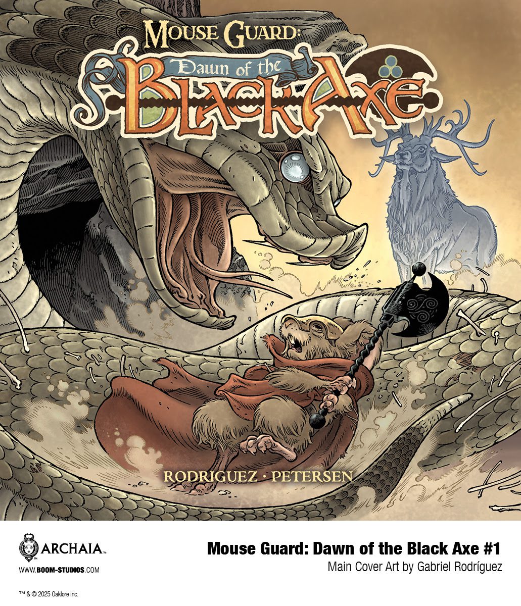 BOOM! Studios today revealed a first look at the brand new MOUSE GUARD: DAWN OF THE BLACK AXE #1. There are few series as lauded and beloved as David Petersen’s Eisner Award-winning and New York Times bestselling Mouse Guard. Now, in celebration of the 20th anniversaries of both Mouse Guard and BOOM! Studios, David Petersen, along with Eisner-nominated artist Gabriel Rodríguez (Locke & Key), bring a brand new chapter to life in this sprawling saga with MOUSE GUARD: DAWN OF THE BLACK AXE.