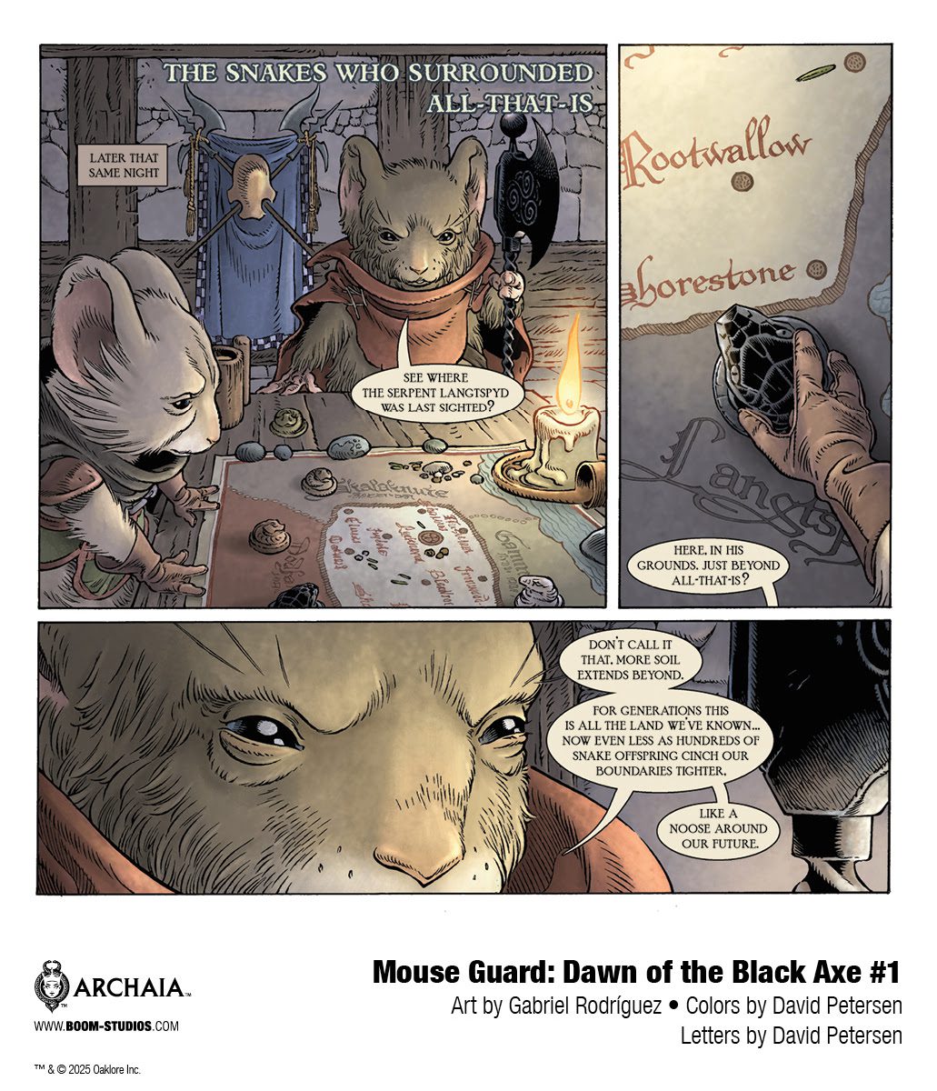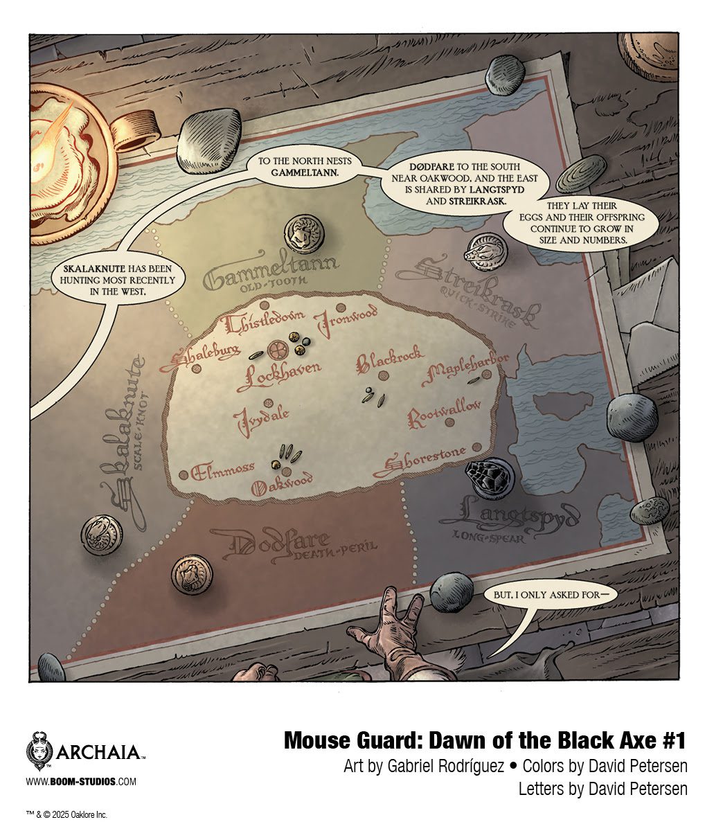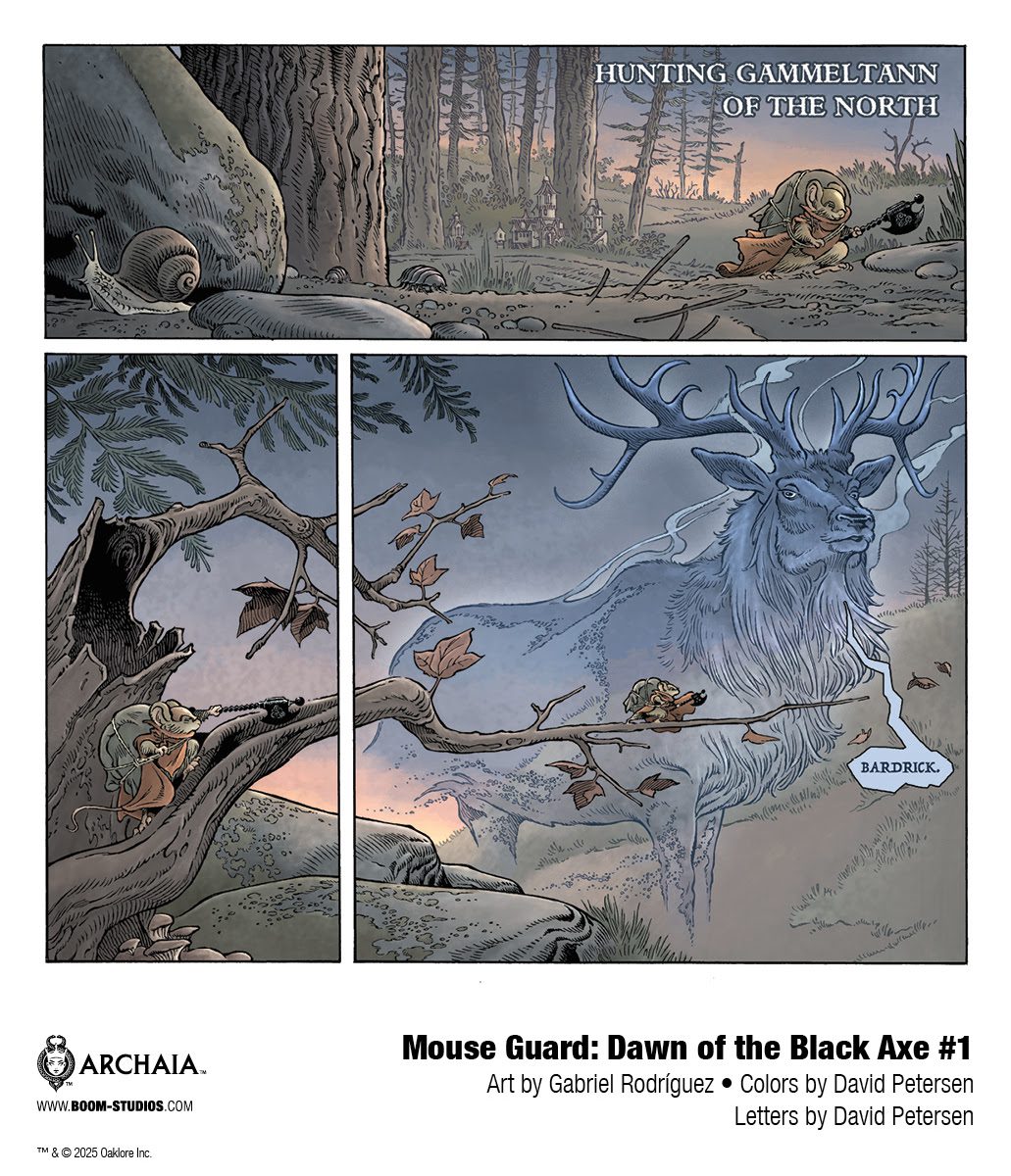 BOOM! Studios today revealed a first look at the brand new MOUSE GUARD: DAWN OF THE BLACK AXE #1. There are few series as lauded and beloved as David Petersen’s Eisner Award-winning and New York Times bestselling Mouse Guard. Now, in celebration of the 20th anniversaries of both Mouse Guard and BOOM! Studios, David Petersen, along with Eisner-nominated artist Gabriel Rodríguez (Locke & Key), bring a brand new chapter to life in this sprawling saga with MOUSE GUARD: DAWN OF THE BLACK AXE.