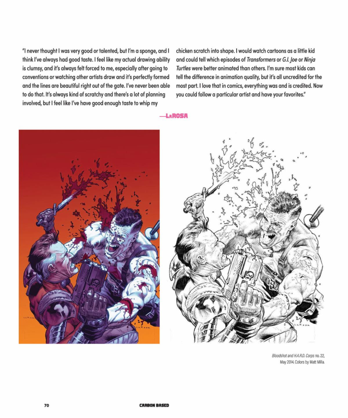 And Oni didn’t stop there. CARBON BASED: THE ART OF LEWIS LAROSA also includes a new introduction by Oni Press president and publisher Hunter Gorinson, page-by-page commentary from LaRosa and former Valiant editor-in-chief Warren Simons, plus appreciations from an all-star lineup of collaborators including Lee Bermejo, Dave Johnson, Matt Kindt, Jeff Lemire, Yanick Paquette, and more. So yeah, this isn’t just an art book. This is a full-on celebration of a creator whose work has been blowing minds for years.