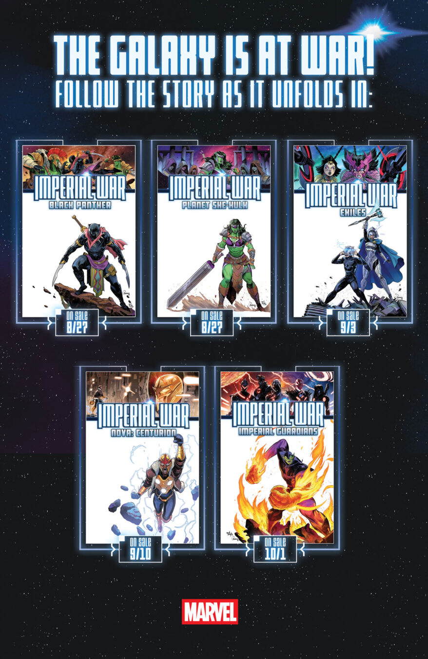 Kicking off with a string of assassinations that erupts into an intergalactic war, IMPERIAL lays the foundation for a new line of space-set series starting with five IMPERIAL WAR one-shots: BLACK PANTHER, PLANET SHE-HULK, EXILES, NOVA: CENTURION, and IMPERIAL GUARDIANS. The latest cover depicts some of the event’s major players including HULK, NOVA, SHURI, STAR-LORD, and SUPER-SKRULL and also teases the involvement of a powerful group that has yet to make their presence in the conflict known…