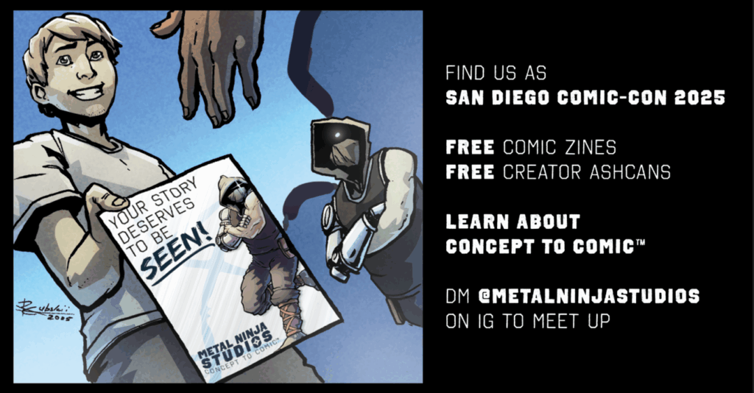 Metal Ninja Studios, the premier full-service comic production company for independent creators and publishers, has ofcially launched Concept to Comic™—a guided production solution that transforms story ideas into professional, pitch-ready comic books. The announcement coincides with the studio’s full team presence at San Diego Comic-Con 2025, where creators can meet the team, claim exclusive merch, and learn how to bring their stories to life without compromise.