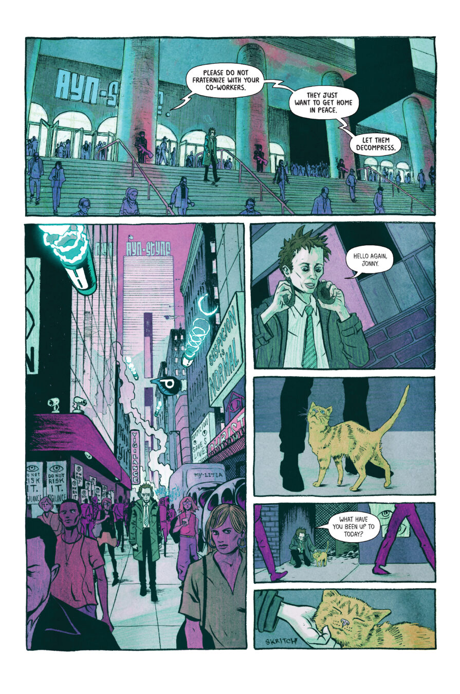 This is a story about Ted and Sarah. Ted, isolated and paranoid, works for a mega-corporation owned by the world’s only trillionaire. He suffers from night terrors, obsessively draws the same mysterious figures again and again, all while listening to one track of music on repeat–oh, and the only “person” he ever talks to is a stray cat. His humanity is hanging by a thread.