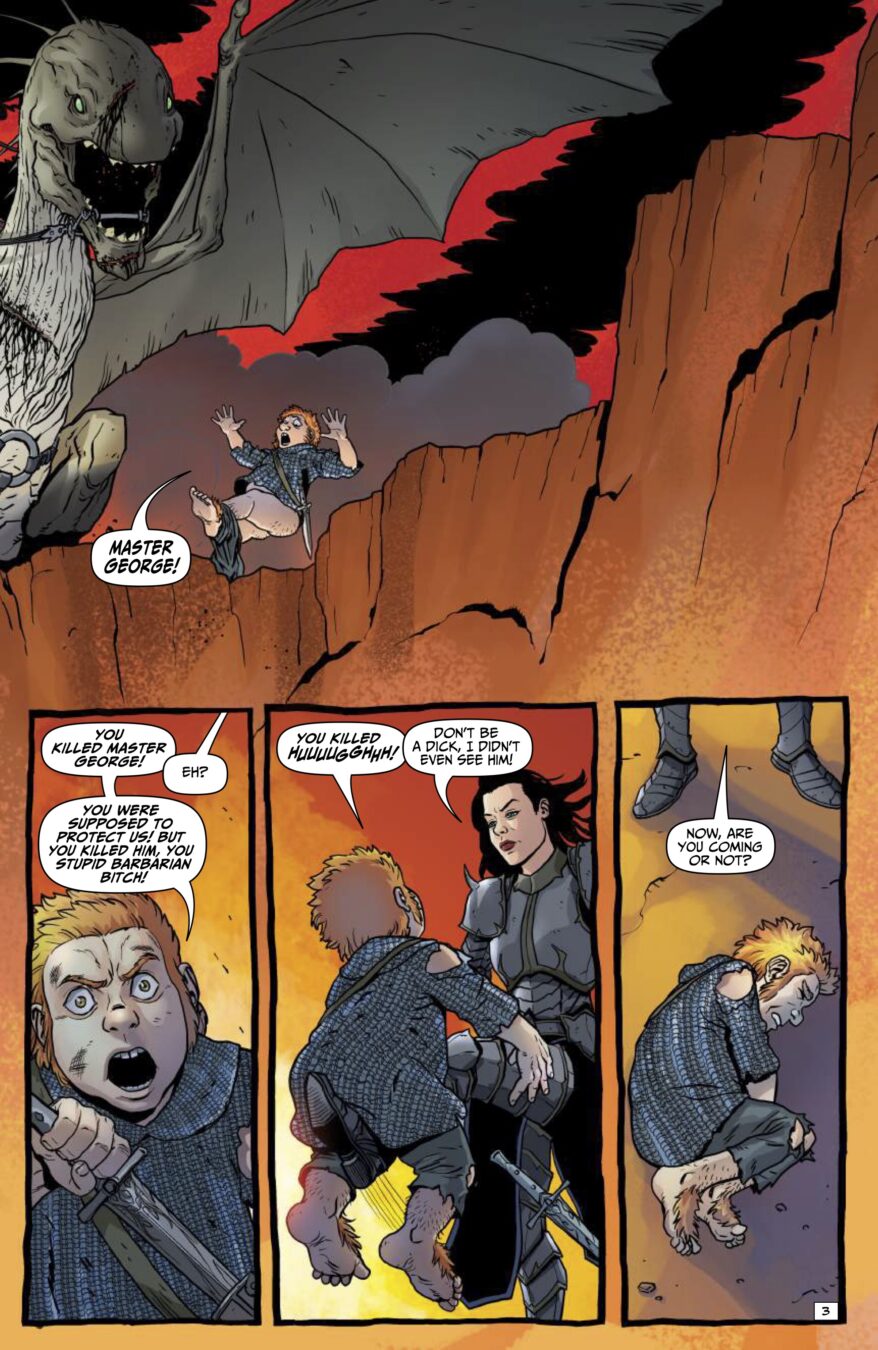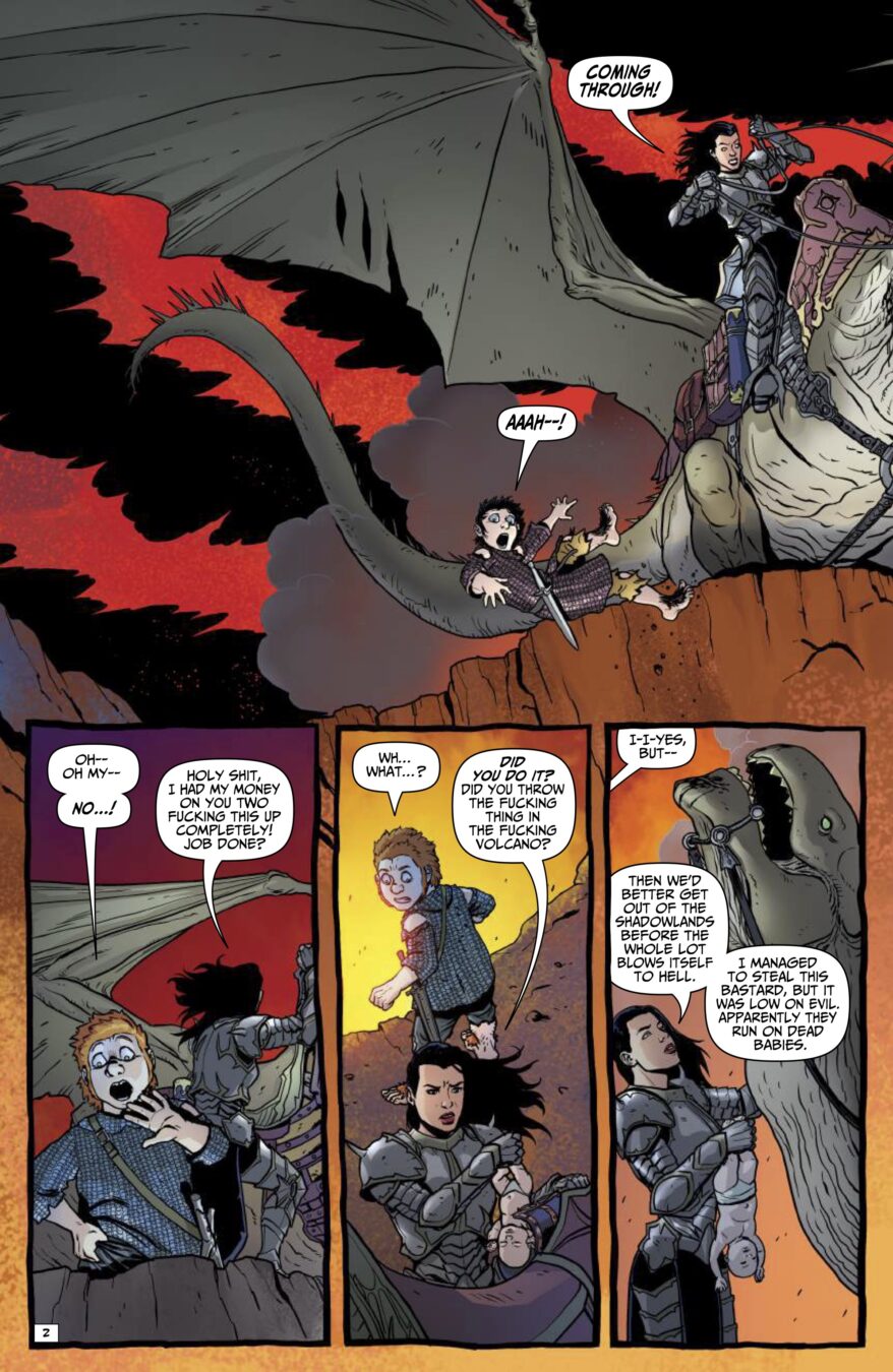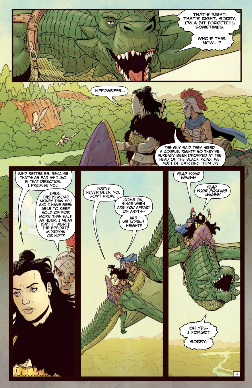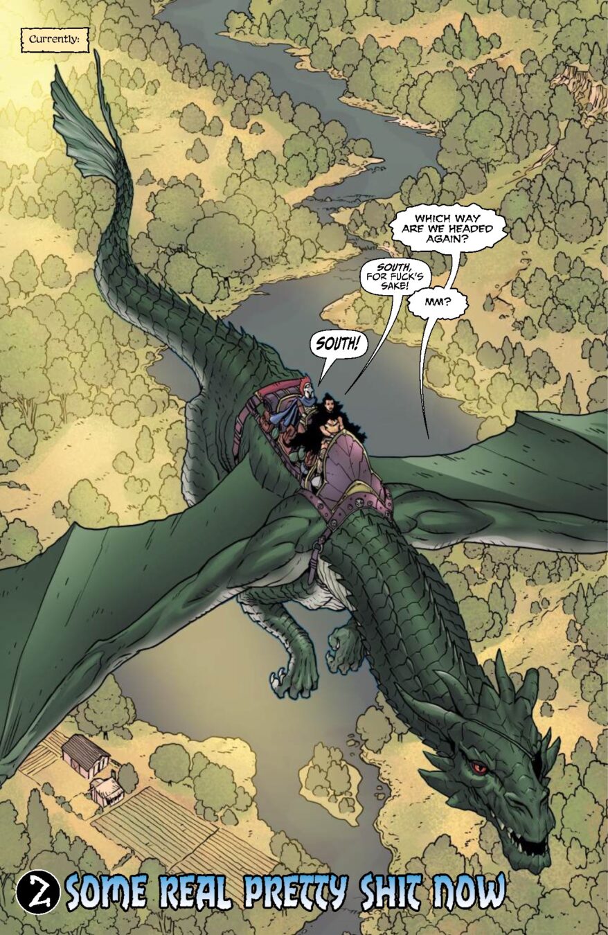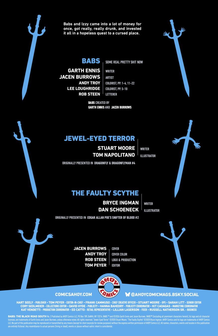 The sword-and-sorcery chaos machine from Garth Ennis and Jacen Burrows (yeah, those mad geniuses behind Crossed and Get Fury) keeps roaring forward, louder, sharper, and way more unhinged. On a no-turning-back quest to reclaim a seriously big pile of treasure, fearless swordswoman Babs and her ride-or-die partner Izzy saddle up with the most emotionally exhausted hired dragon you’ve ever met and head straight down the Black Road South.