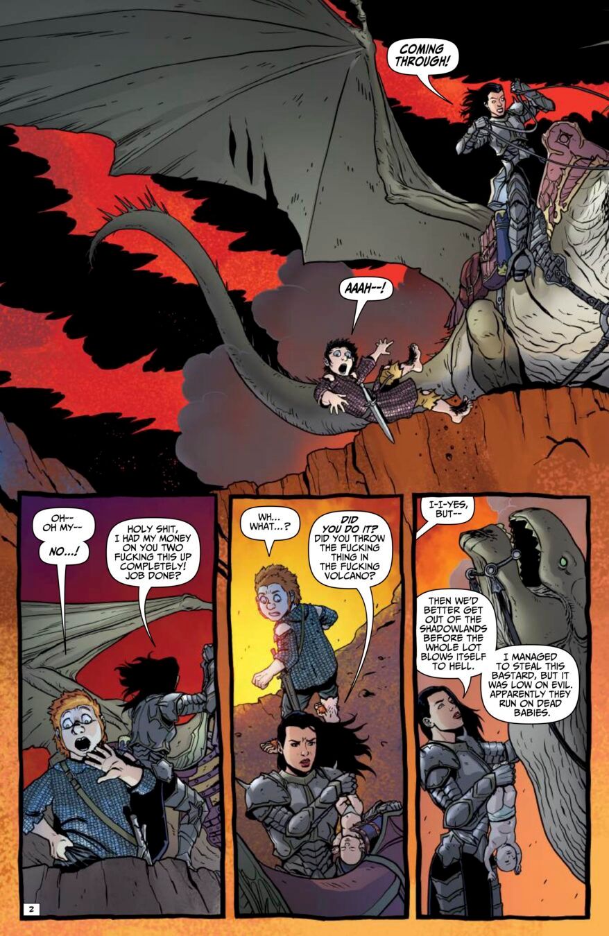 The sword-and-sorcery chaos machine from Garth Ennis and Jacen Burrows (yeah, those mad geniuses behind Crossed and Get Fury) keeps roaring forward, louder, sharper, and way more unhinged. On a no-turning-back quest to reclaim a seriously big pile of treasure, fearless swordswoman Babs and her ride-or-die partner Izzy saddle up with the most emotionally exhausted hired dragon you’ve ever met and head straight down the Black Road South.
