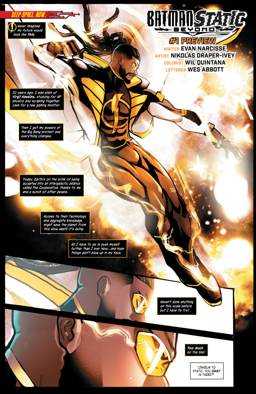 Writer Evan Narcisse (Rise of the Black Panther, Batman: Gotham Knights – Gilded City) brings his signature blend of character-driven storytelling and high-concept futurism to Batman/Static: Beyond, while artist Nikolas Draper-Ivey (Static: Shadows of Dakota) delivers bold, kinetic visuals that fuse cyberpunk grit with electric energy. Together, the creative team reimagines two fan-favorite heroes for a new generation, pushing the boundaries of legacy and innovation within the DC Elseworlds imprint.