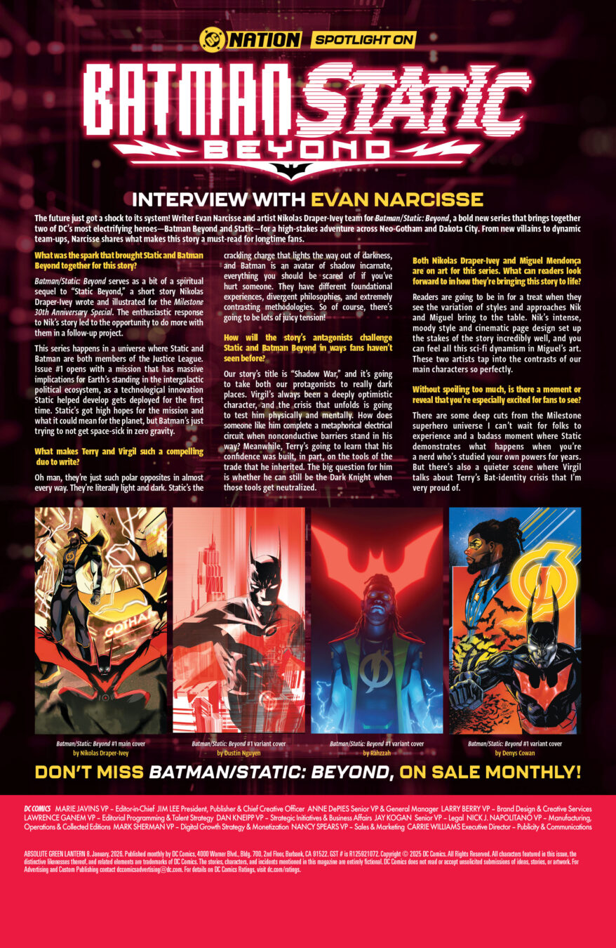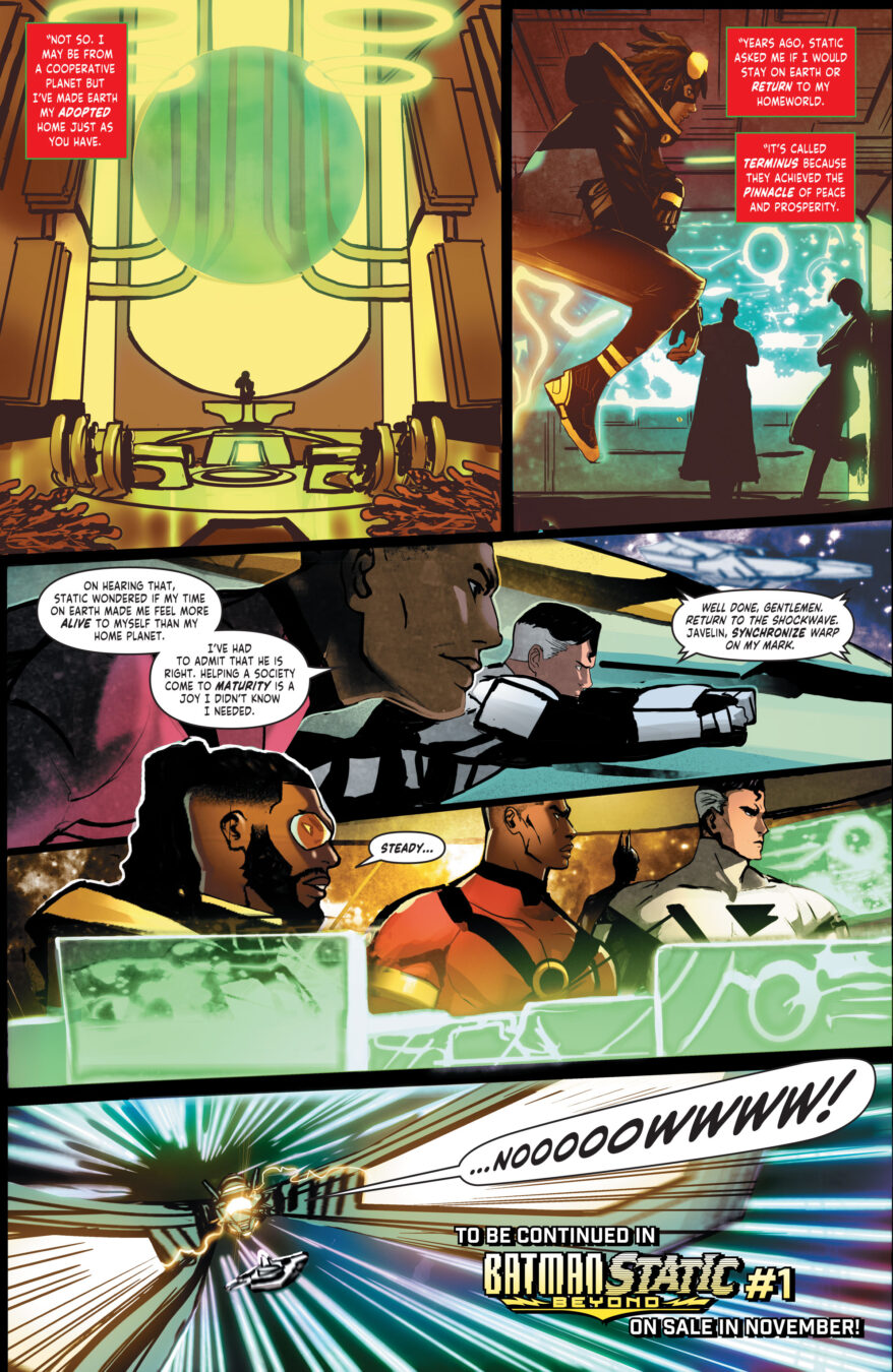 In the debut issue, Terry McGinnis patrols the neon-lit streets of Neo-Gotham while Virgil Hawkins pioneers a technological revolution with the launch of the Q-Wave Energy Grid. As Earth prepares to join a powerful interplanetary alliance called the Cooperative, the Justice League Beyond stands ready to usher in a new era of peace. But when a mysterious villain triggers a global blackout, the planet’s future hangs in the balance. With technology crippled and chaos rising, Static and Batman Beyond must forge an unlikely alliance and take a grounded approach to saving the world before it’s too late.