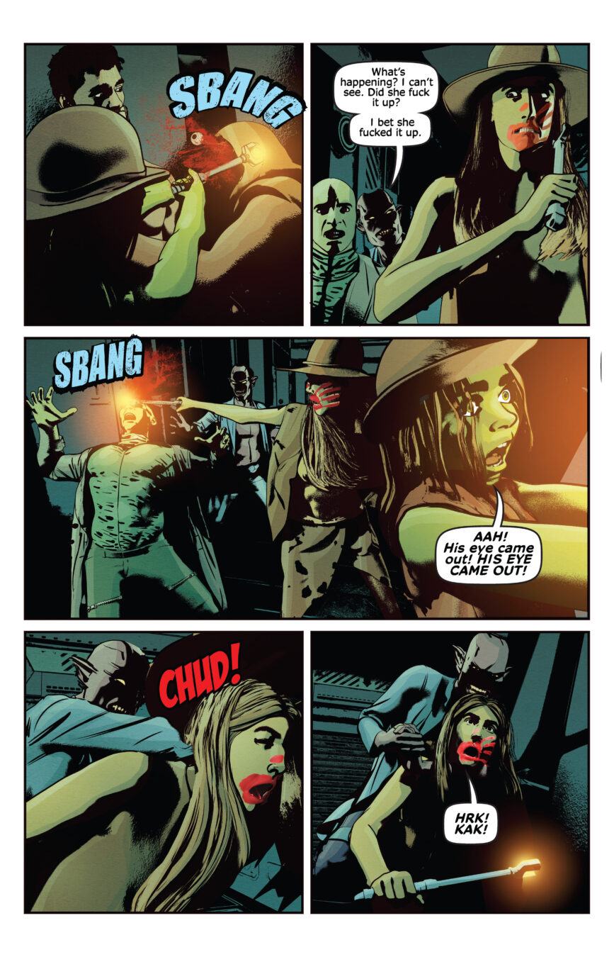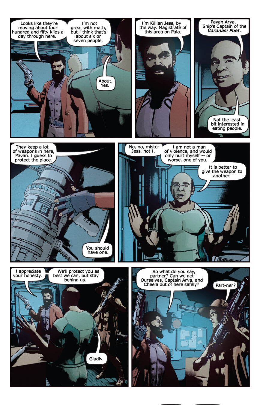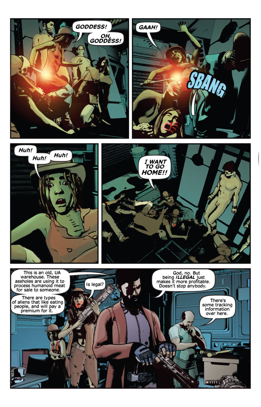 Halley, the sister of Killian’s former partner wants her dead sibling’s old job, and as her first mission she takes Killian, and Cheela on a dangerous journey through a converted meat factory that doesn’t deal in farmed animal, they sell humans as food—including Killian and Cheela.