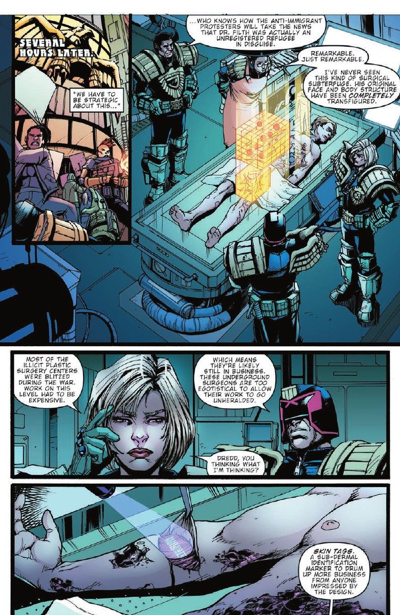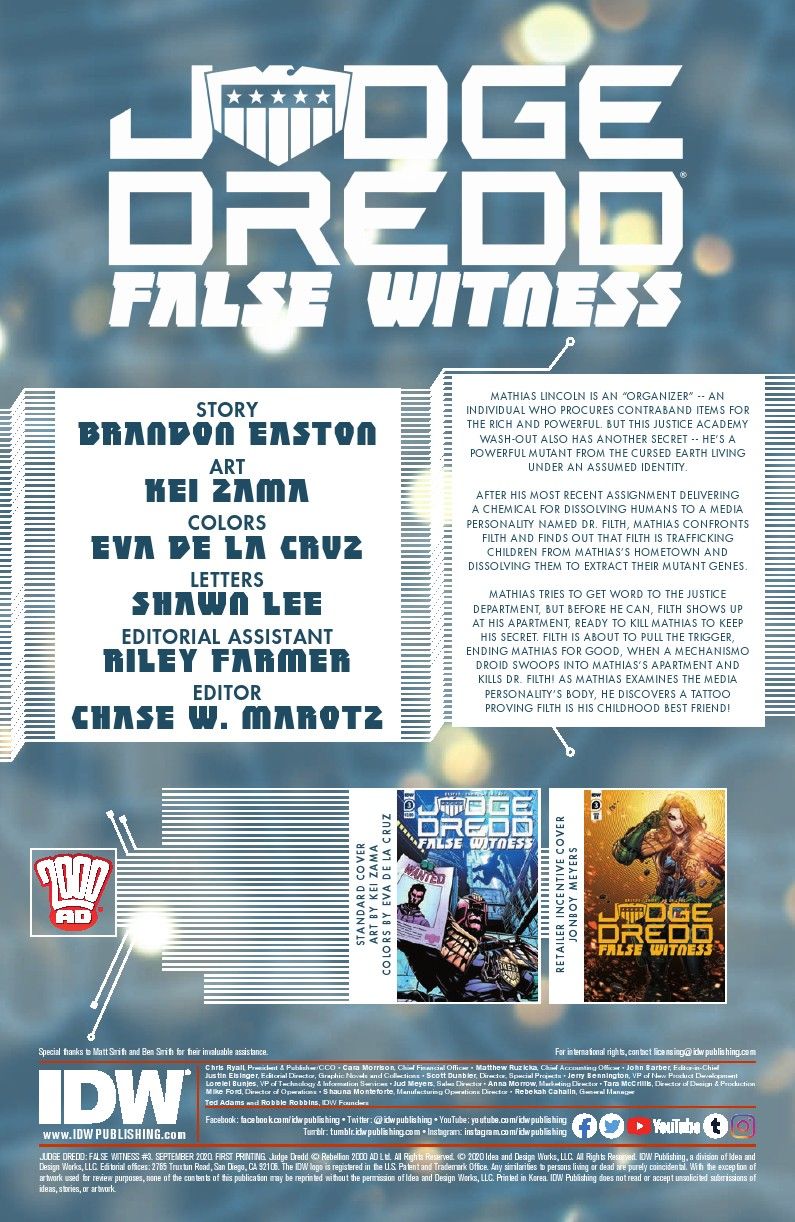After being framed for the murder of a high-profile citizen, Mathias Lincoln is now the most wanted person in Mega-City One. But as Mathias tries to evade the Judges searching for him, Judge Dredd uncovers a shocking secret about Dr. Filth that will change everything! Don’t miss the penultimate issue of this amazing new Judge Dredd arc from Brandon Easton (Star Trek: Year Five, M.A.S.K.) and Kei Zama (Transformers, Death’s Head)!