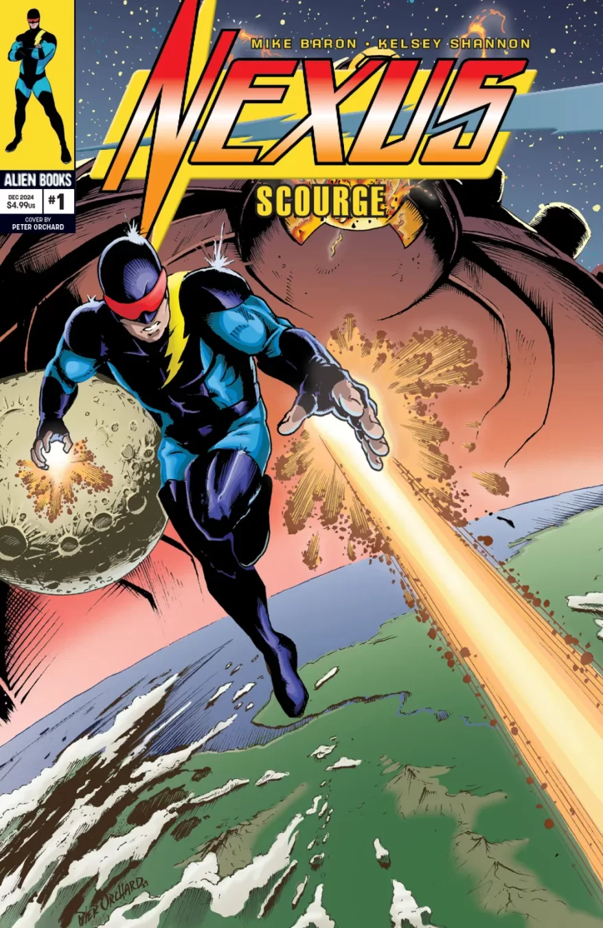 Mike Baron and Steve Rude’s Nexus enters a new era with classic characters and an all-new villain that’s destroying the universe one planet at a time. It’s a breathtaking new vision for the Nexus Universe by series co-creator Mike Baron and up and coming artist Kelsey Shannon (Batman Adventures, GI Joe). Nexus: Scourge is an all-new era of Nexus; a two-issue event by Mike Baron and Kelsey Shannon exclusively from Alien Books! Planet destroying action and a wry wit that’s perfect for fans of Hitchhiker’s Guide to the Galaxy and classic Doctor Who.