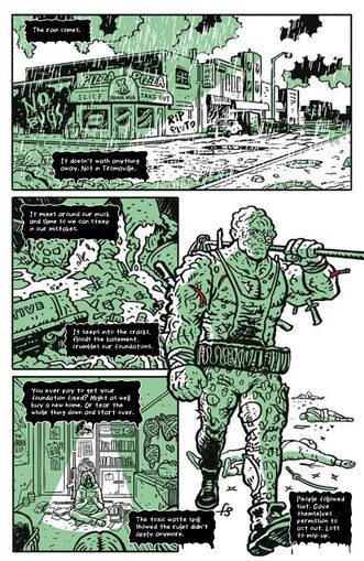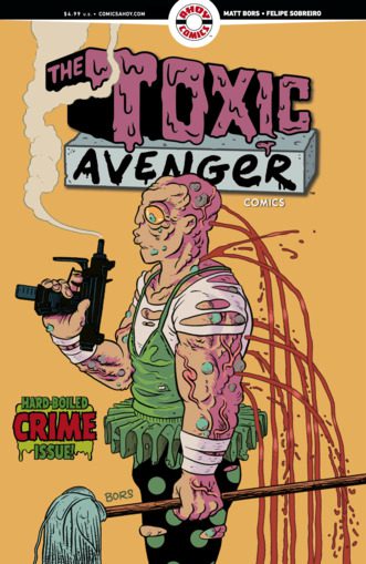 Crime issue! A dead body lies on a rainswept street in the neon light of downtown Tromaville. A note pinned to the corpse points the accusing finger at the Toxic Avenger, leading an armored SWAT team to surround his junkyard! Featuring two incentive covers: one by writer Matt Bors, and a photo cover tying in to this summer’s all-new TOXIC AVENGER blockbuster film.