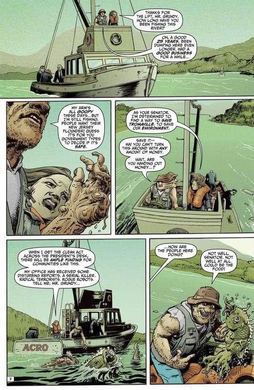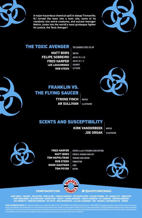 Crime issue! A dead body lies on a rainswept street in the neon light of downtown Tromaville. A note pinned to the corpse points the accusing finger at the Toxic Avenger, leading an armored SWAT team to surround his junkyard! Featuring two incentive covers: one by writer Matt Bors, and a photo cover tying in to this summer’s all-new TOXIC AVENGER blockbuster film.