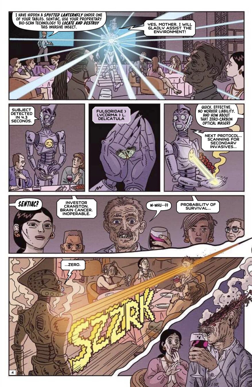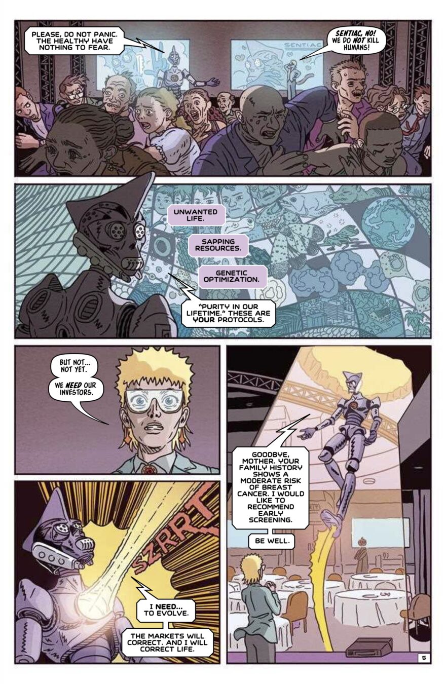 Sentiac, an artificial intelligence in an armored body, thinks it should rid the world of all imperfect humans! The Toxic Avenger disagrees! Art by Tristan Wright, whose TOXIC CRUSADERS series premieres this month! Cover A and flashforward vignette drawn by Fred Harper! And watch for the gross Matt Bors variant depicting Toxie relieving Troma Entertainment bigwig Lloyd Kaufman of his intestines! Bleagh!!!