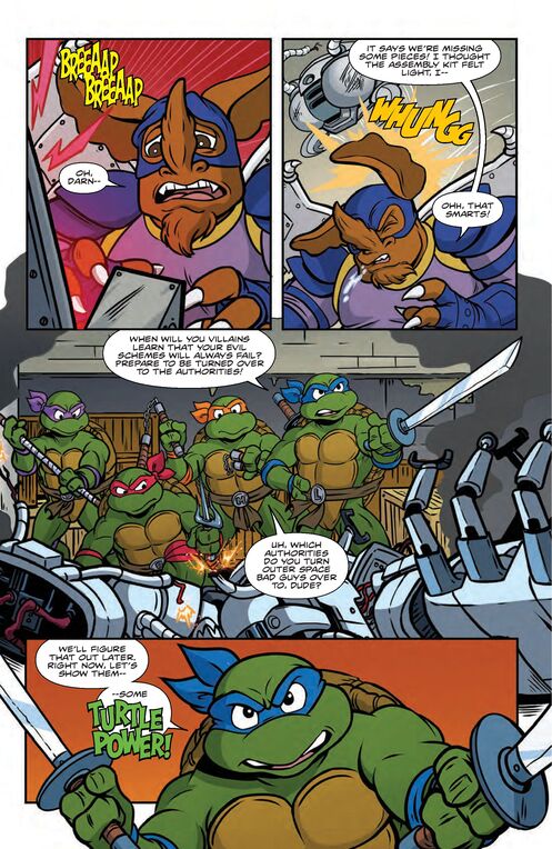 Once upon a time, the Teenage Mutant Ninja Turtles encountered Mr. Ogg, a card-carrying trickster type from an alternate dimension. Now he’s back and it’s no more Mr. Nice Guy as Ogg charges the Turtles with a crime that they’re most definitely guilty of, and Raphael is the guiltiest of all! It’s an extradimensional accusation of the meta kind-with some bonus extraterrestrials to boot in the form of Wingnut and Screwloose-all in this issue of Saturday Morning Adventures!