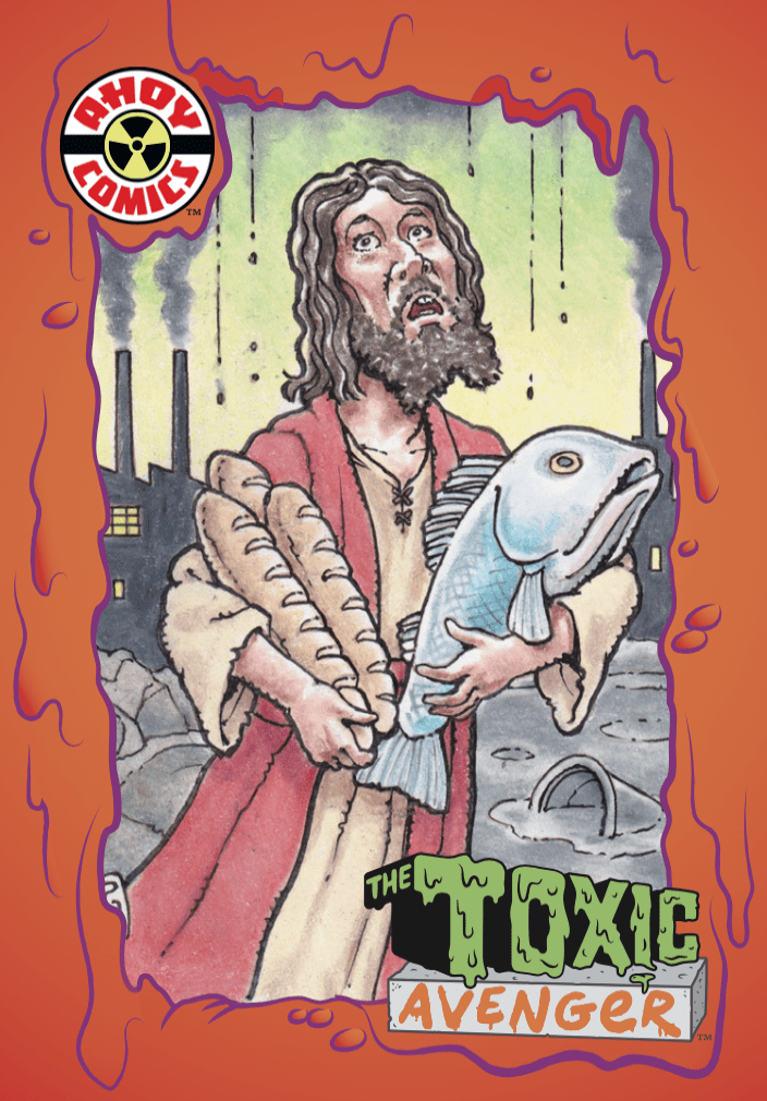 Spinning straight out of his acclaimed solo title, the Toxic Avenger battles alongside some of comics’ greatest and most controversial superstars in this surprise limited series. First up, from AHOY’s own SECOND COMING: Jesus Christ, the Son of God! Written and drawn by that smash hit comic’s creative team, Mark Russell (Batman: Dark Age) and Richard Pace, with a cover by Toxie’s own artist, Fred Harper!