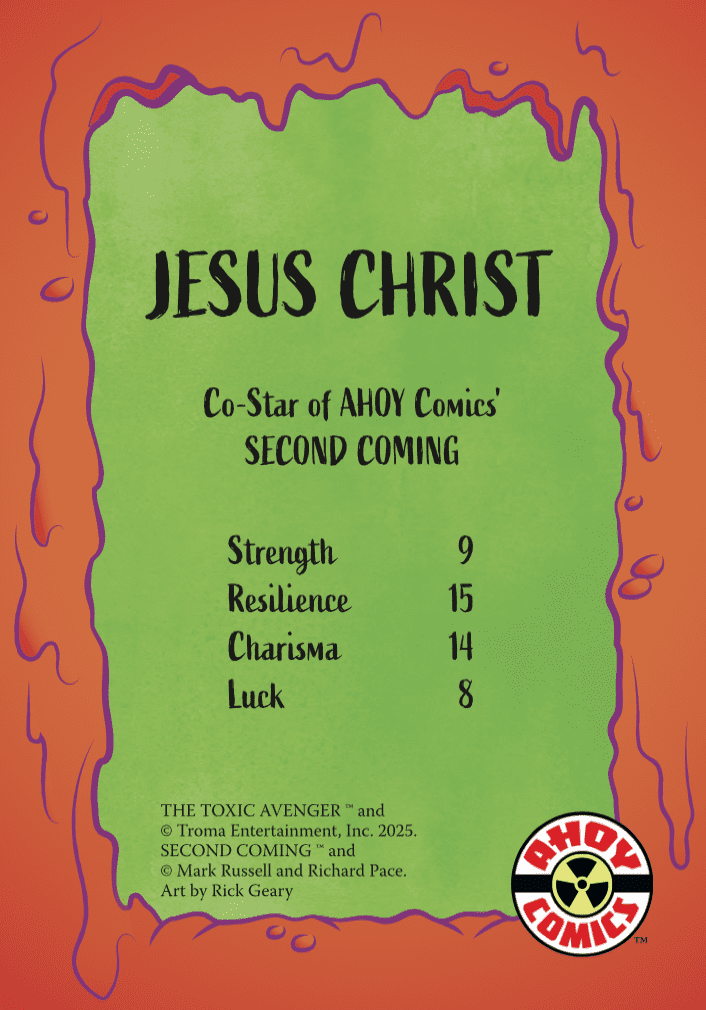Spinning straight out of his acclaimed solo title, the Toxic Avenger battles alongside some of comics’ greatest and most controversial superstars in this surprise limited series. First up, from AHOY’s own SECOND COMING: Jesus Christ, the Son of God! Written and drawn by that smash hit comic’s creative team, Mark Russell (Batman: Dark Age) and Richard Pace, with a cover by Toxie’s own artist, Fred Harper!