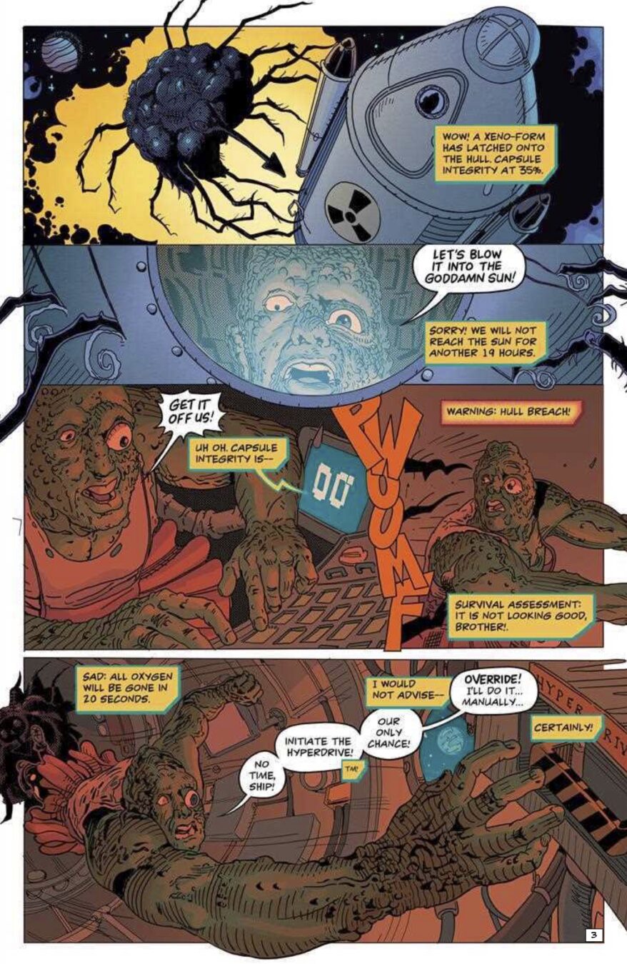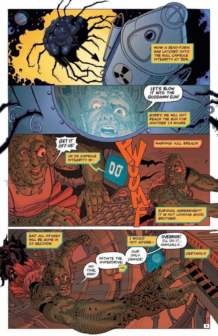 Breakout writer Matt Bors’s (The Nib) two AHOY series collide in a hail of bullets! Appointed by the President to dump a cargo of waste in outer space, the Toxic Avenger touches back down to Earth in the dangerous future of the Justice Warriors. Officers Swamp and Schitt fight, subdue, and arrest him before the menace of a radioactive space invader forces them to team up. Because that’s how team-up comics work!