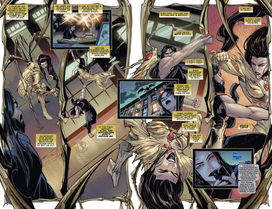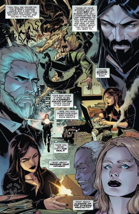 Left battered and beaten, Sara narrowly escapes from Kenneth Iron’s arena and takes refuge by night in the mystical space of “The Keep” in order to stay off the billionaire’s radar. By day, Sara gets back to the business of being a cop while her training with Ian Nottingham continues. Sara starts to piece together the connections between her father’s murder and its ties to supernatural forces around her. One lead, the mob enforcer, twenty-year-old Jackie Estacado, has been on Sara’s radar. Her brief encounter with him previously left her shaken and wondering what the true nature of this dark killer is and how he is connected to the forces of darkness and light that have shaped her life. In these pages, Sara and Jackie finally clash, and the universe will never be the same!