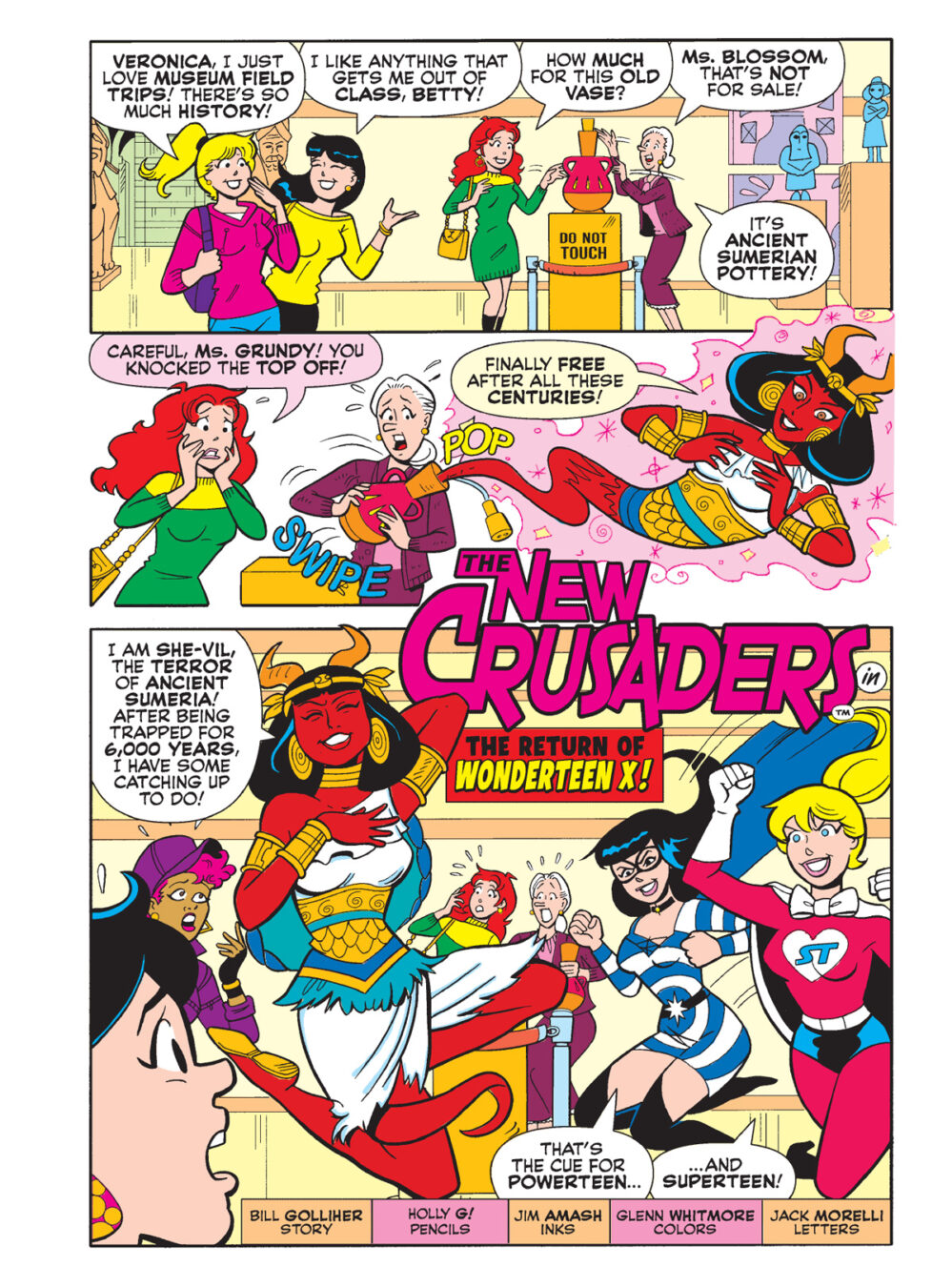 A broken urn at the Riverdale Museum has unleashed an ancient spirit that threatens to menace the whole town. It’s up to Powerteen and Super Teen to save the day! But when they’re joined by an enigmatic new suphero, WonderTeen X, they’ll have two mysteries to solve: how to contain the ancient spirit and finding out who this new hero is!