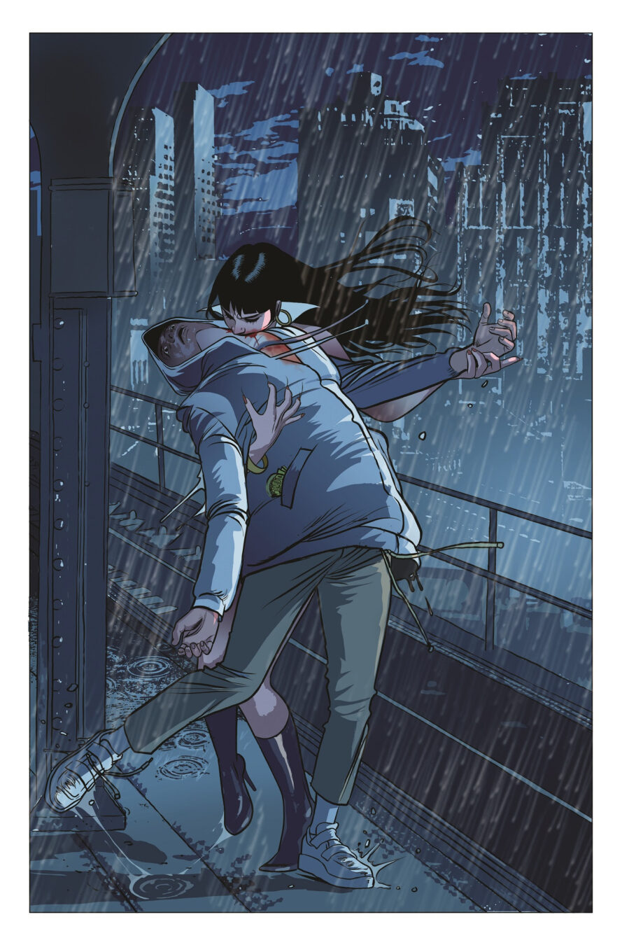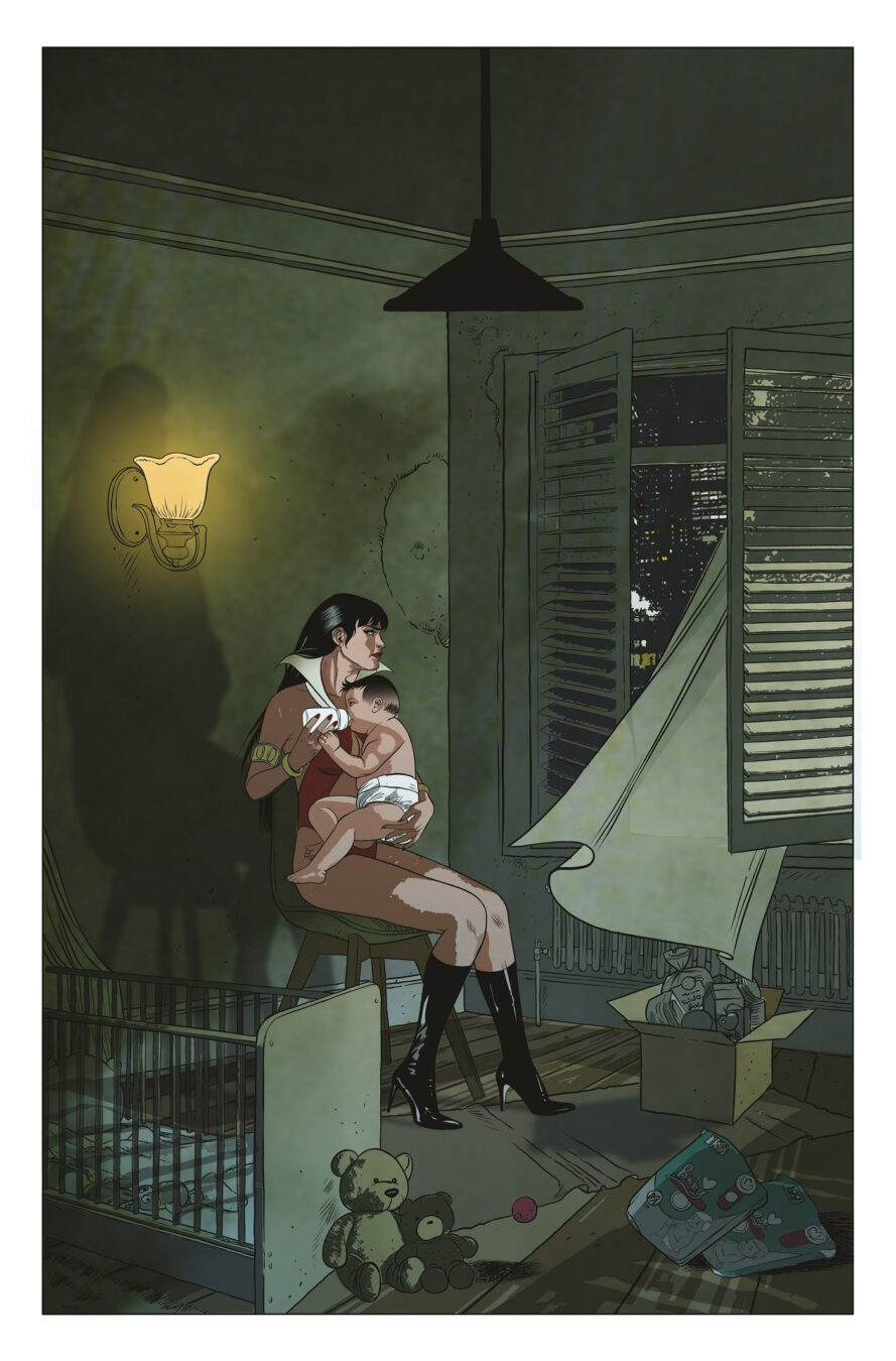 “I think the best kinds of challenges you can toss at a protagonist are the ones they cannot punch through. There’s way too much boring violence being used to resolve conflict in today’s comics,” said Christopher Priest. “Good writing involves conflict but conflict isn’t always about violence. You put your character in a headlock, in a no-win scenario, ideally in a mess of their own making, and then follow them as they resolve that conflict through their strength of character. Vampirella’s present situation, her being suddenly confounded by the unimaginable impact of motherhood, is the direct cause and effect of the future story and the reason her son, an adult many decades in the future, has returned to warn her.”