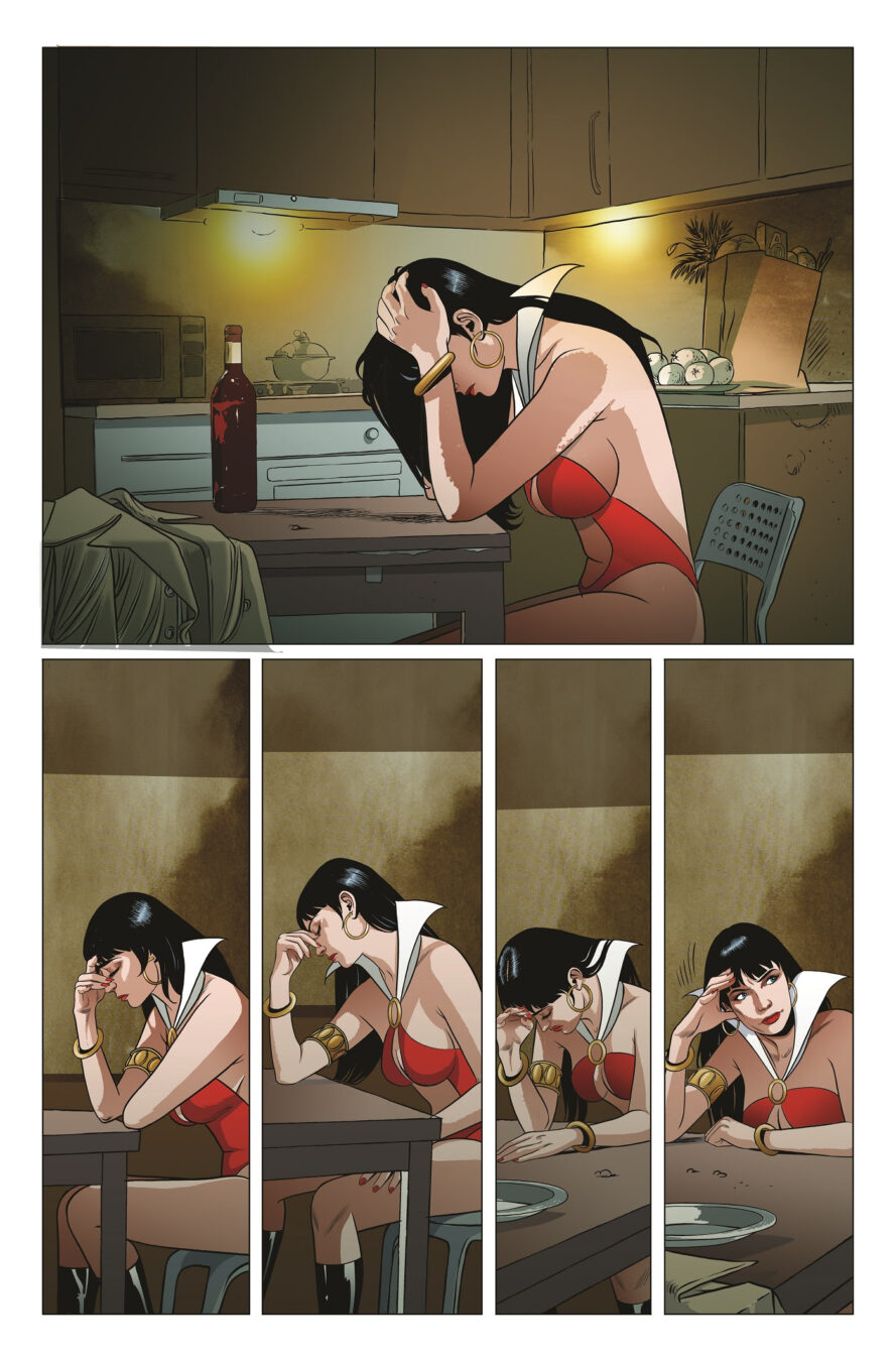 The new story, “The Long Night” will introduce fans to parallel perspectives of the Daughter of Drakulon in the present dealing with a severe case of postpartum depression, even while finally reunited with her previously stolen infant son — and on the other hand a vision into a possible cataclysmic, cyberpunk future brought on by a bitter Vampi’s nuclear holocaust!