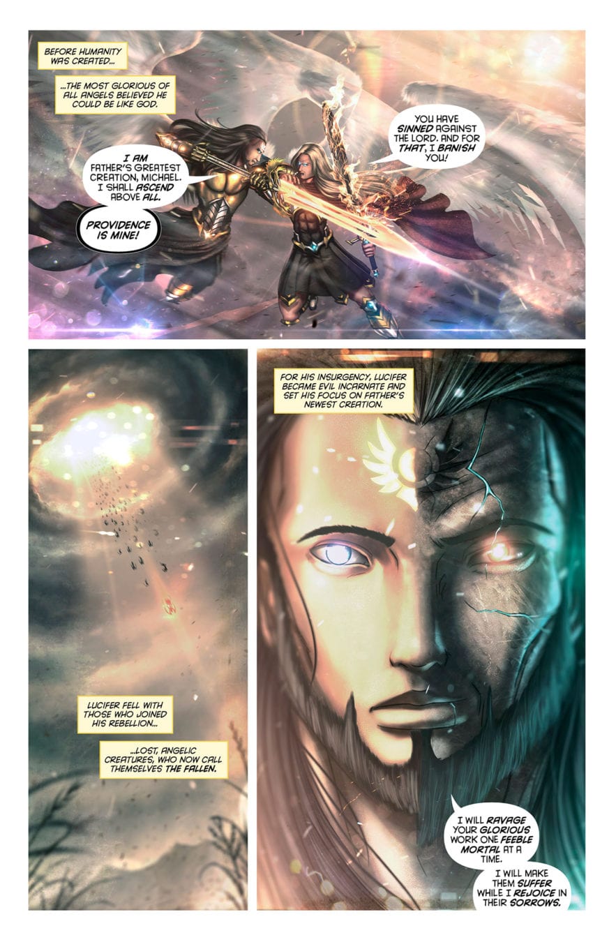 The first three issues of this title have set up the coming war. David brings a human element to the narrative, his naive nature tempers his indomitable spirit in the face of such insurmountable consequences. Of course that’s the beauty of David, in some ways even more than Jesus, David represents humanity in the court of the Divine. London makes these characters relatable without diminishing the angelic nature of their being, he casts them in the light of their amplified character aspects. They are larger than life while possessing flaws of their own, on a scale commensurate to their station and that is what London does so well. The drama he creates by telling this story from the Archangels perspective allows us to feel everything on that level as well, the frustration of Michael seeking to win Lucifer over to the side of the angels, the pain of that loss and all while fighting to defend the Father’s vacant Throne which has become synonymous with God’s Legacy.