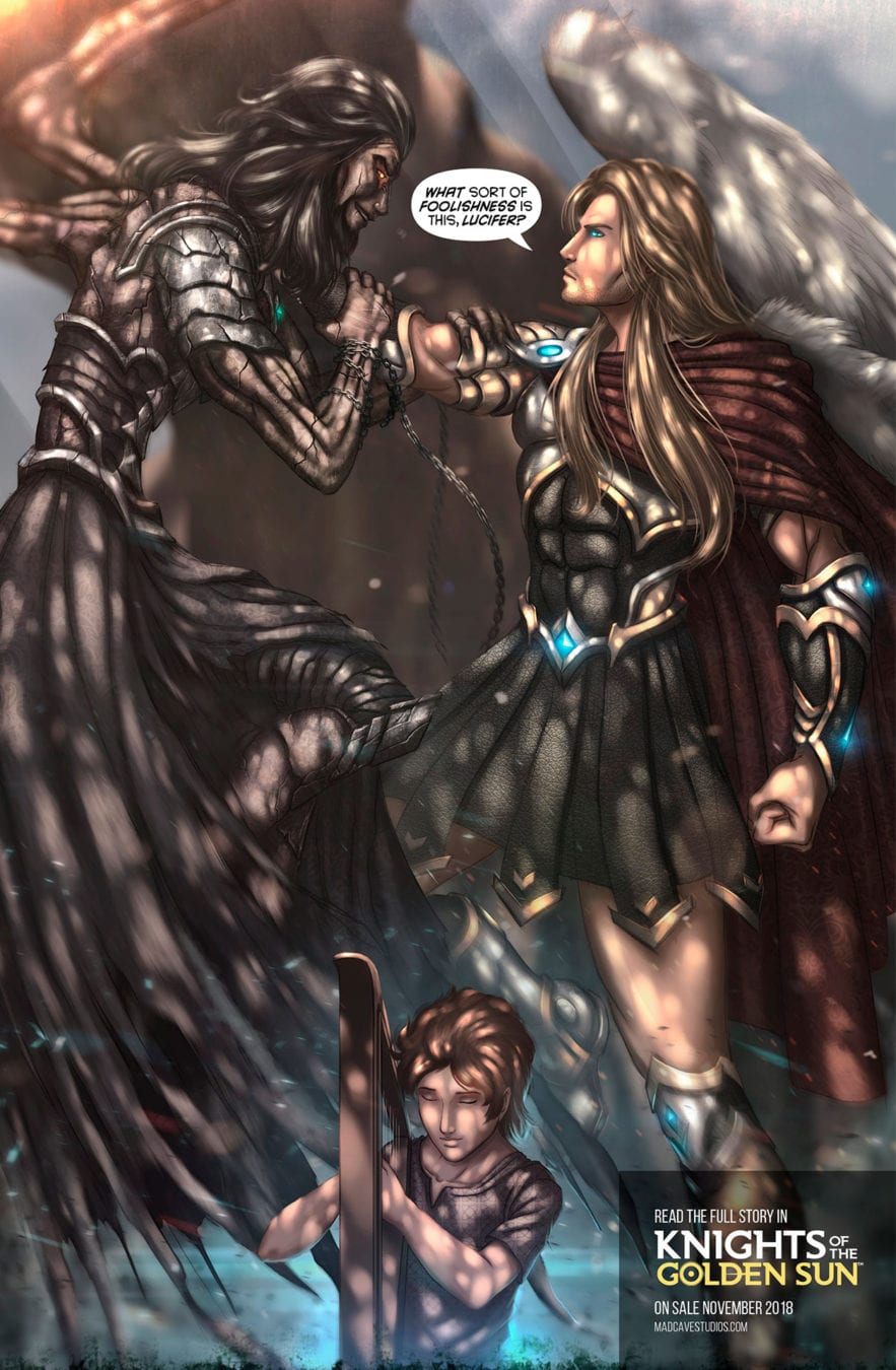 From the Old Testament to the New Mutants we have always been fascinated by heroics and the bigger the better. So it really should come as no surprise that so many of our most cherished spandex clad super heroes can trace their divine roots directly back to the sandal and toga sporting protagonists of the ancient religious writings from the scriptures of the Judeo-Christian teachings, the Koranic writings of Islam, as well as many of the Eastern teachings of the Krishna and Buddhism. Certainly there is nothing more heroic than saving all of humanity and since that is at the core of most of these writings I don’t see it as much of a stretch to consider these the very first super hero stories. Just imagine a Justice League: Divine featuring Judas Maccabeus aka The Hammer, King David, Moses, Miriam aka The Water Bringer, Mary the Mother of God and Jesus aka The Lion. The battles they would fight to save the world from the Legion (for we are many) of Doom would be, well biblical. With heroes and heroines like this filling the pages of the Bible, the Koran, the Talmud and volumes of other sacred tomes, why look anywhere else for inspiration? Well the creators of Knights of the Golden Sun at Mad Cave Studios did just that and the result is one of the most original titles to hit the racks in quite some time. Writer Mark London and artist Mauricio Villarreal have set their archangel epic in the 400 hundred year span between the Old and New Testaments, a time when God was said to have left the throne of Providence vacant. During this tumultuous time an all out war erupted between the powers of good and evil in the Archangels and the Fallen ones led by Lucifer.