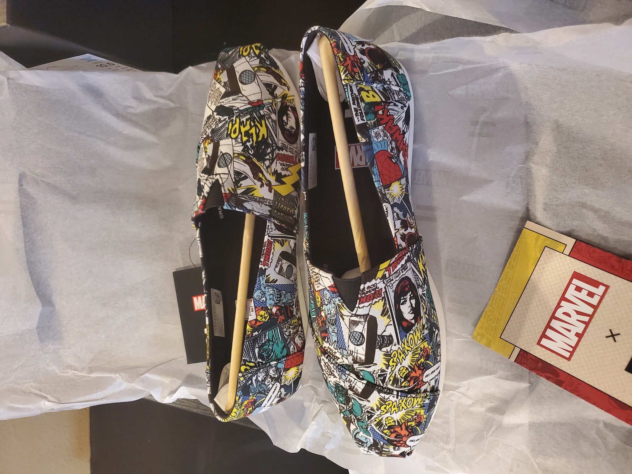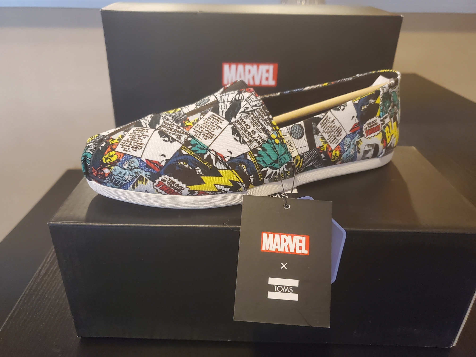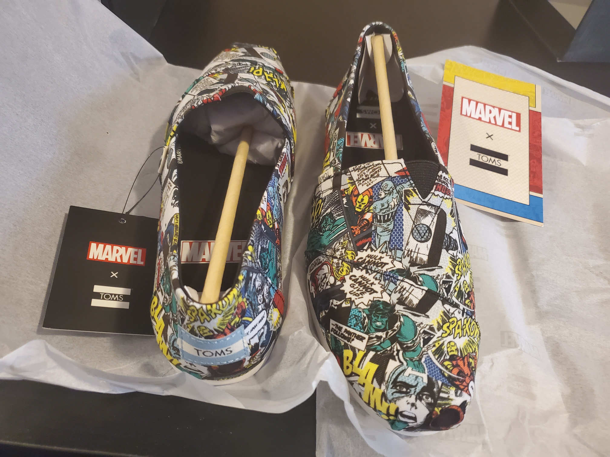 Before I begin I want to thank TOMS for the free pair of shoes to try for both my wife and I. I have fallen in love with these kicks and had to give you the low down on these joint! OK, so maybe I’m biased because they are comic book based! Yes, these kicks are special edition Marvel 80th Anniversary line. The shoes look like fire and have a great swag to them!
