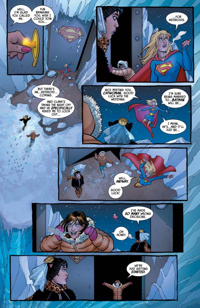 The story is the sixth part in King’s painfully slow Knightmares arc which for some reason now focuses on Selina and Lois. The pair is apparently on some sort of ridiculously grandiose girls’ night out at the Fortress of Solitude complete with wines from all over the galaxy, an euphoric swimming pool and a Full Monty style male stripper revue featuring robotic replicas of Superman. King misses the mark on Lois by a Kryptonian mile and while his Selina Kyle is closer to the character as we know her, his character work is thin and without the slightest bit of depth. The girls’ male counterparts busy themselves trying to spend a relaxing night at stately Wayne Manor, however neither Bruce nor Clark appear to have much luck even enjoying a friendly game of chess. Both seem preoccupied wondering what their respective significant other is up to. The issue continues in this vein as Lois and Selina now intoxicated on “space wine” entertain one another with an impromptu fashion show, trying on several Super costumes.