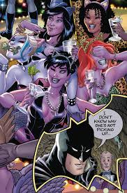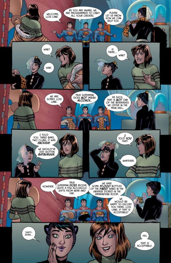 The story is the sixth part in King’s painfully slow Knightmares arc which for some reason now focuses on Selina and Lois. The pair is apparently on some sort of ridiculously grandiose girls’ night out at the Fortress of Solitude complete with wines from all over the galaxy, an euphoric swimming pool and a Full Monty style male stripper revue featuring robotic replicas of Superman. King misses the mark on Lois by a Kryptonian mile and while his Selina Kyle is closer to the character as we know her, his character work is thin and without the slightest bit of depth. The girls’ male counterparts busy themselves trying to spend a relaxing night at stately Wayne Manor, however neither Bruce nor Clark appear to have much luck even enjoying a friendly game of chess. Both seem preoccupied wondering what their respective significant other is up to. The issue continues in this vein as Lois and Selina now intoxicated on “space wine” entertain one another with an impromptu fashion show, trying on several Super costumes.