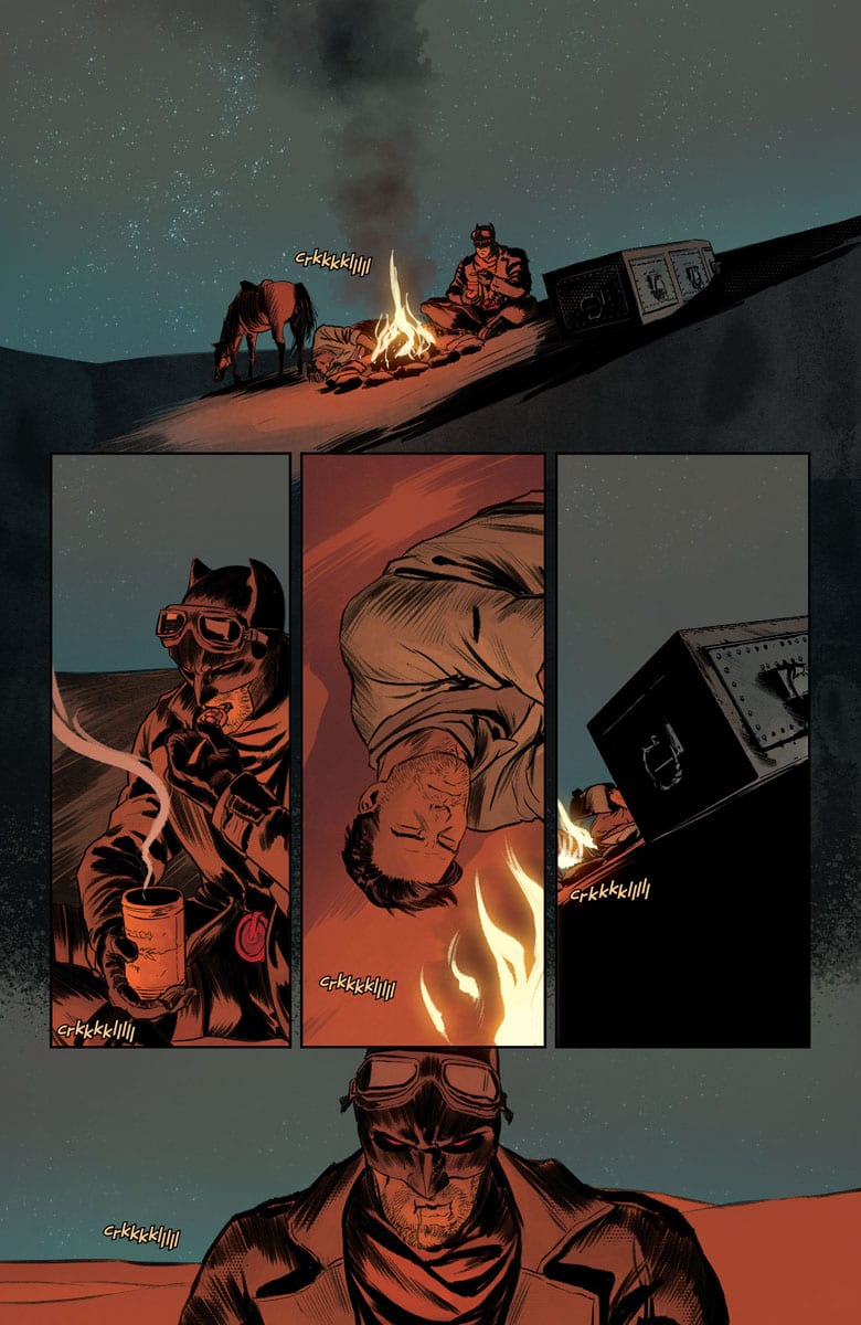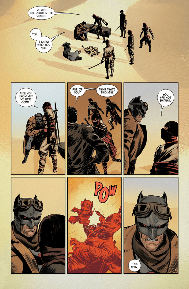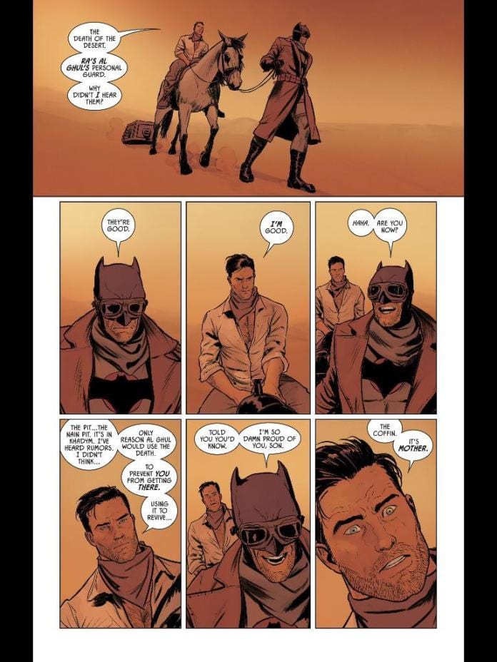 Visually this issue doesn’t pack the punch of Janin’s previous work on the title, but that is mostly due to King’s script being set in the desert. Janin’s sequential art storytelling prowess still shines through, however its in his brilliant use of facial expressions. The emotional range Janin accesses is amazing, particularly when you consider the fact that both characters are wearing cowls through most of the book. Colorist extraordinaire Jordie Bellaire captures the dreamlike atmosphere perfectly with muted tones and a precise use of light and shadow.