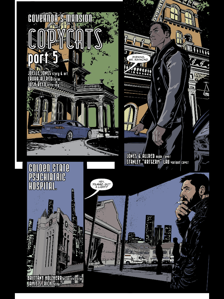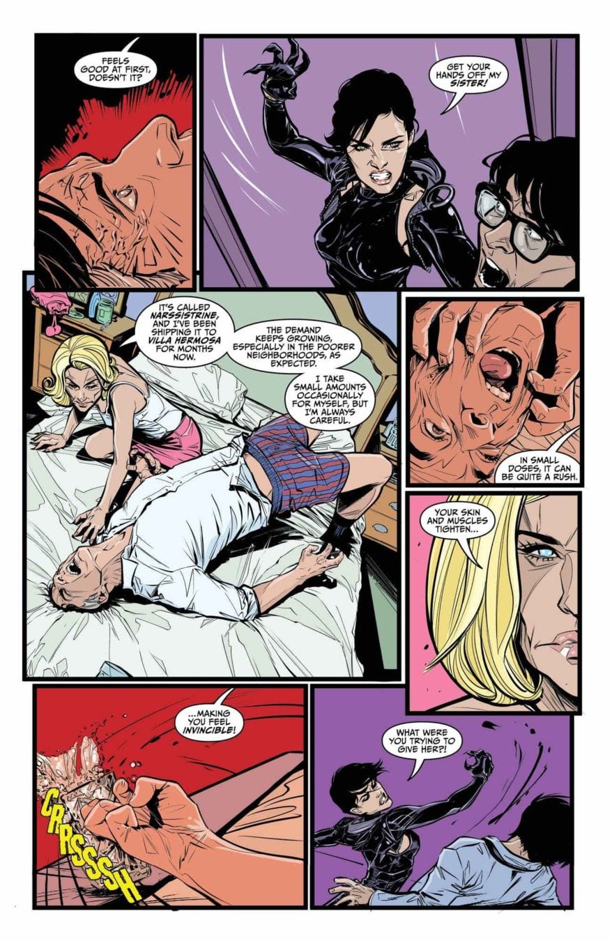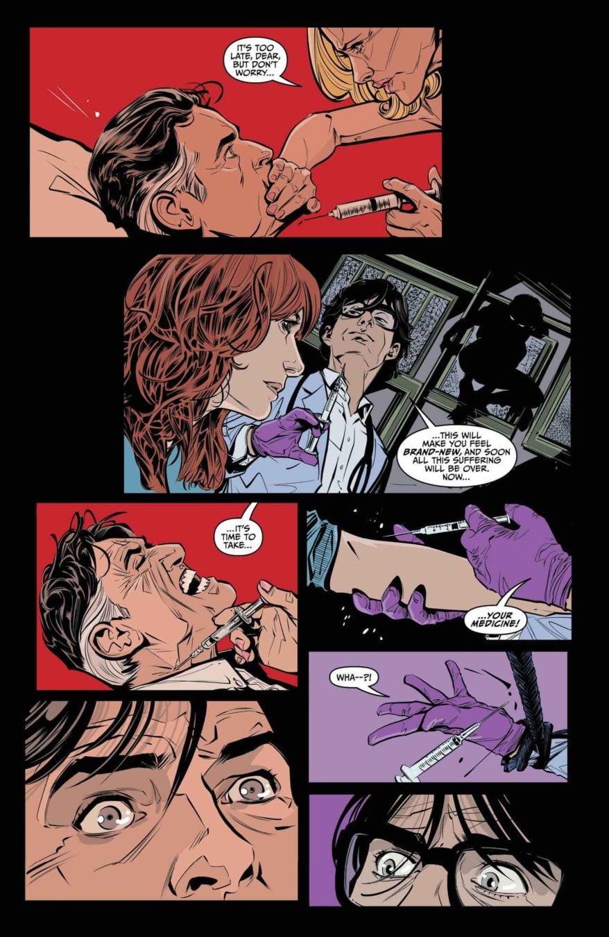 In an issue so visually stunning it would be easy to get lost in the rich, deeply engrossing artwork, however Jones keeps the emotional stakes extremely high and the intricate narrative unfolds at such a methodical pace that it pulls you in beyond the intensely intriguing images. The narrative is perfectly paced, there isn’t a single wasted panel or unnecessary word balloon. Jones budgets her dialog to get the most from each utterance a character makes. There is a weight to each word, balanced precisely for optimum effect. This is essentially a crime noir story and Jones nails that tonal quality both with her script and visually. The blood soaked sheets, the ominous syringe, the close-ups of wide eyes staring into their doom coming from just off page, these images make your blood run cold and they stay with you long after you have read the final word. Like an old black and white Drag Net episode, this book has a visual vocabulary that transcends time, it touches those places inside us all that provoke our fear responses, but there is a sensuality to it as well. Not so much in an erotic sense, but certainly in a carnal sense like the best examples of cinematic noir. There is a David Lychian aesthetic at work here that speaks to the elegance maintained while Selina performs unspeakable acts of violence.