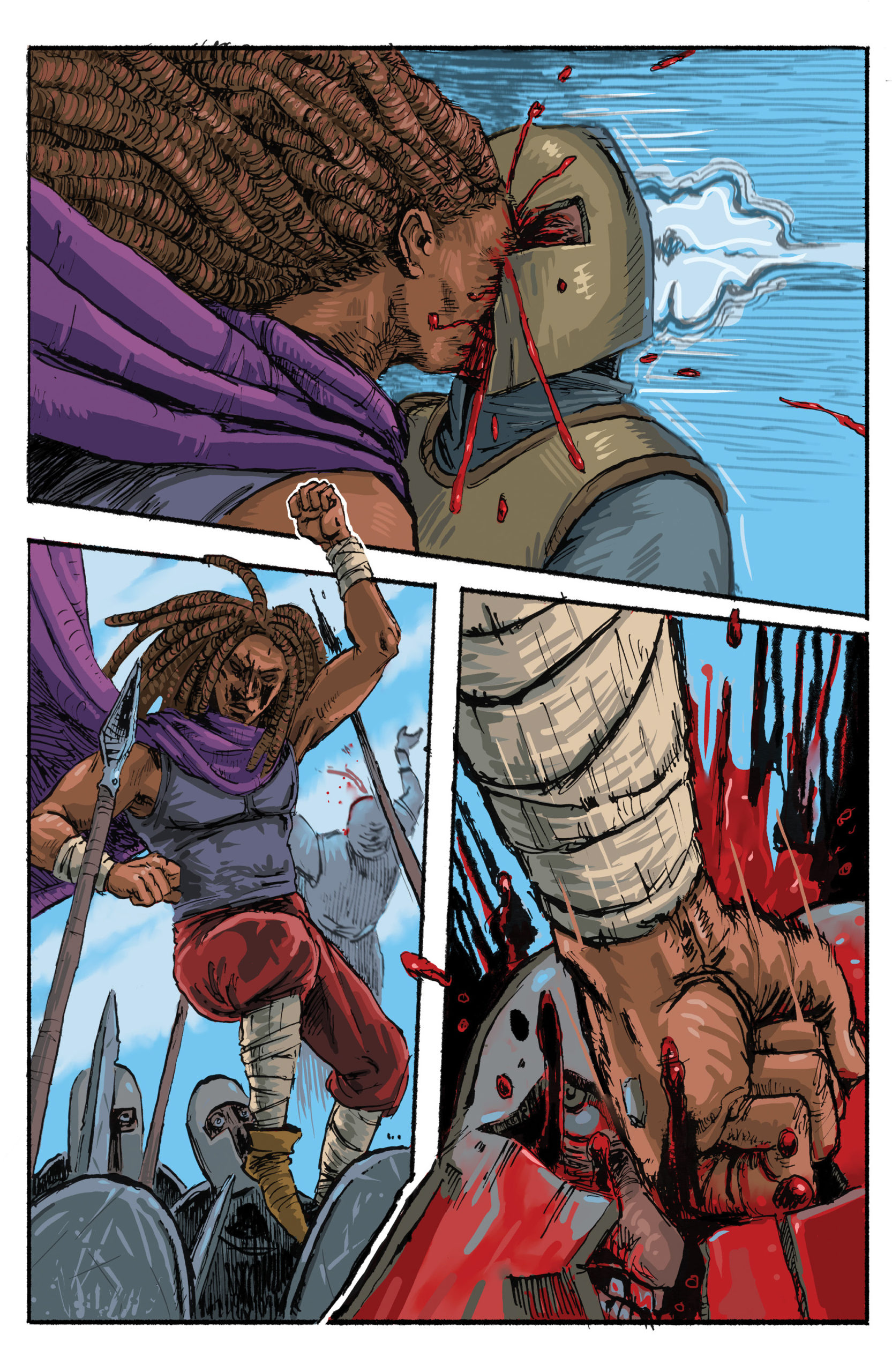 Visually this work is a masterpiece of sequential art storytelling. Artists Mervyn Mckoy, Renee Reeser, Nick Sadek, Jabari Weathers, AJ Frena, Vincent Rodriguez, Eli Powell and Jon Bass and colorists Jonathan Hunt, Justin Wood, Mat Lopes, Peyton Freeman and Carlos Jimenez have collaborated to create some of the most gorgeous artwork in recent memory. The subject matter certainly allows for indulgence, as any sword and sandals piece, however there is an air of fine art at work here. Hunt and company’s colors are intense, but beyond that the color choices are intelligent and dynamic bringing a sense of the fantastic to the imagery. The visual language used is equally as poetic as the narrative language. There is a beauty to both even when the setting is the battlefield. The violence, while graphic at times is never self-indulgent or shocking, quite to the contrary its depicted in a tasteful yet effective style. The characters are designed and rendered beautifully with an eye toward realism, however there is more than enough stylized imagery in mind melting colors to make any fan of Frazetta happy. The page designs were also very effective in capturing a cinematic feel. The panels flow one into another as the story unfolds. The visual consistency obtained with the use of so many contributing artists is truly amazing. There is a uniformity of design yet a diversity of style that combine to work exceedingly well as a singular work.