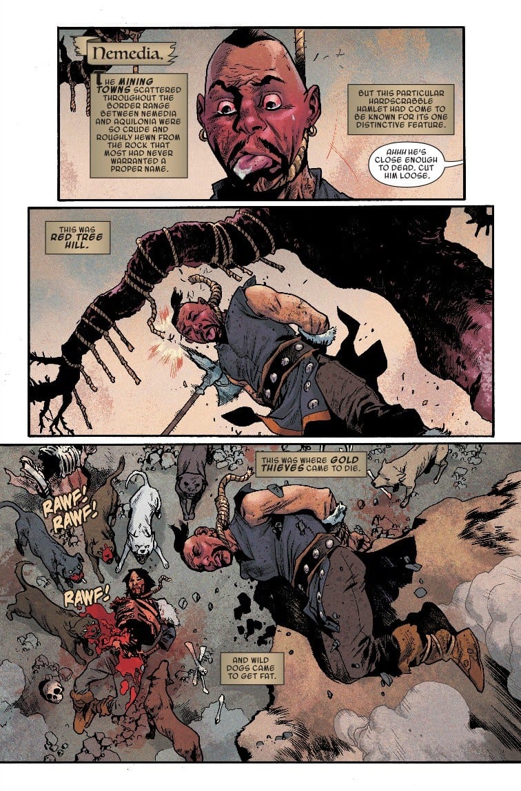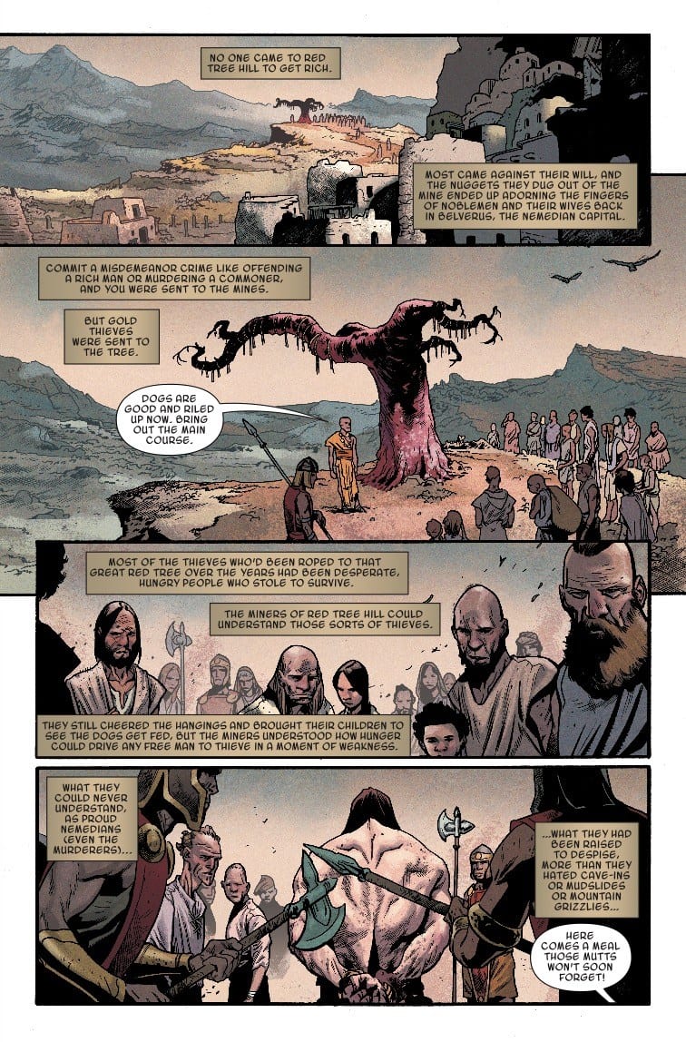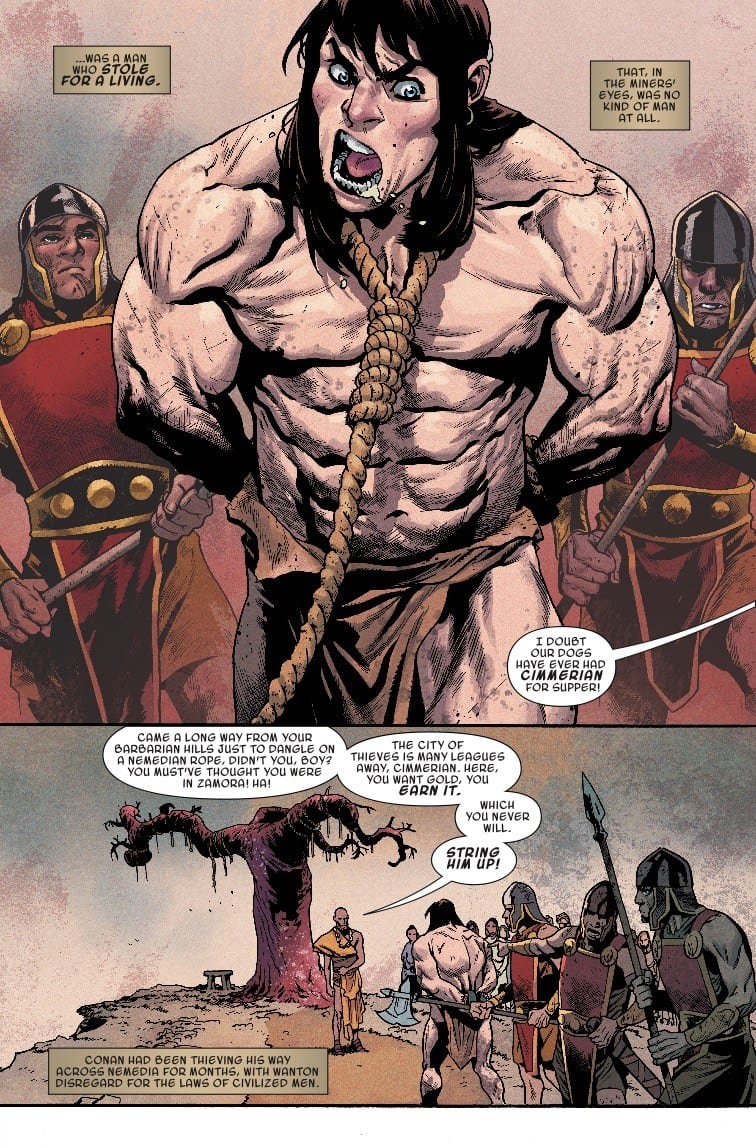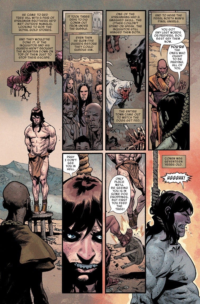 The current issue of Conan the Barbarian begins with a flashback to a seventeen year old Conan who has been thieving his way through Nemedia, particularly the bordering mining towns. His felonious endeavors are rather abruptly curtailed by the local constabulary and Conan finds himself facing justice at the end of a rope. Red Tree Hill is known for the executions that are held there daily and the ravenous dogs that gather there in packs to fill their bellies with the freshly deceased danglers cut down from the gnarled branches of the great Red Tree that stood like a silent sentinel atop the hill. Conan is marched out, the noose hanging about his massive neck like some morbid piece of ancient formal wear, a necktie to die for if you will. However, the hungry dogs are not so easily fed when their dinner is to consist of Conan. The ensuing action is some of Aaron’s most inspired work. I have been a fan of his writing for quite some time, his Thor run is the stuff of legend, so when I say this Conan run has all the earmarks of being on par with Aaron’s Asgardian epic you know it is high praise indeed.