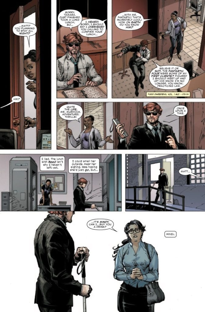 When we look closely at this arc ,it is the story of Matt Murdock and how he fits into this particular time in his life. He is questioning himself, his very core beliefs not only as a hero, but as a Catholic, a legislator and a man. Zdarsky examines each of those aspects of character, pertaining to Matt Murdock exclusively, not Daredevil. This arc presents both sides of the Matt Murdock/Daredevil paradigm. These are two very singular characters, not just two aspects of the same and Zdarsky does a incredibly thorough job of exploring that point, thematically and philosophically. The relationship beats are especially revealing; Matt and Mindy are from very different worlds, however there is a commonality in there shared differences that further define one another. This is what sets this relationship apart from the others Matt has had over the years.