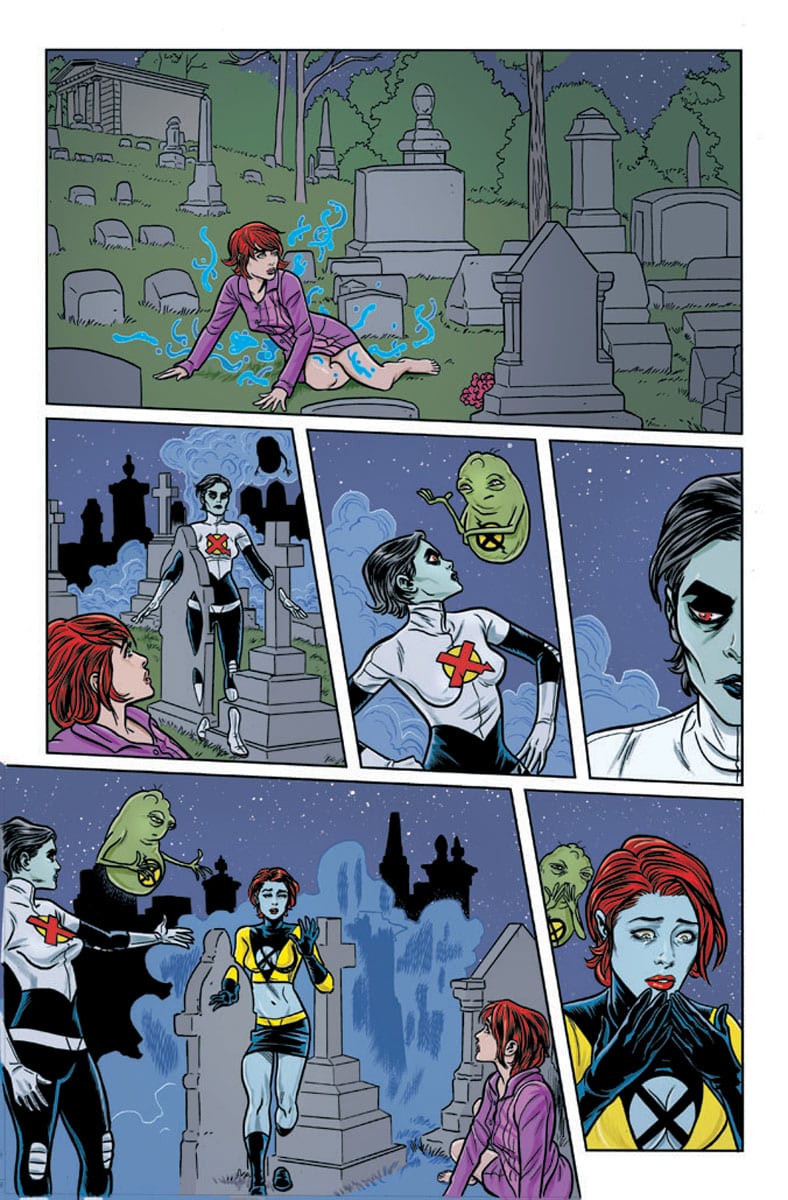 As is the case with the entire run of X-Statix, there is an aura of the unorthodox at work here that permeates the pages with a strangeness, an utter otherness that would make Grant Morrison smile. Milligan does a fabulous job of introducing new readers to the vivacious world of the X-Statix as well as bringing returning readers back up to speed without an exposition-heavy info dump of an issue. Far the flip from it, in fact this issue is completely new reader friendly while maintaining everything that made first time readers into loyal fans of the title. The story unfolds through the eyes of Katie Jones, once thought to be the younger sister of deceased team member, Edie Sawyer aka U-Go Girl we now find out that her connection to the former teleporter is drastically different and dramatically explosive. As the narrative begins, Katie is ,like most of the world, following the exploits of the X-Statix as a fan, especially where Edie Sawyer is concerned. Milligan’s dialog expertise takes center stage in this issue as he fills just about single word balloon with razor sharp quips, authentic sounding banter and just plain brilliant dialog. There is a relevance to the narrative that comes across via the social media and reality show aspects of the story. These elements have long been a part of the X-Statix backstory and Milligan does a fine job of upping the ante in those areas, bringing those elements up to date and into focus through the lens of 2019. The urgency of Katie Jones’ story is enhanced by not only her personal stakes, but by the team’s very real need for her to become one of them.