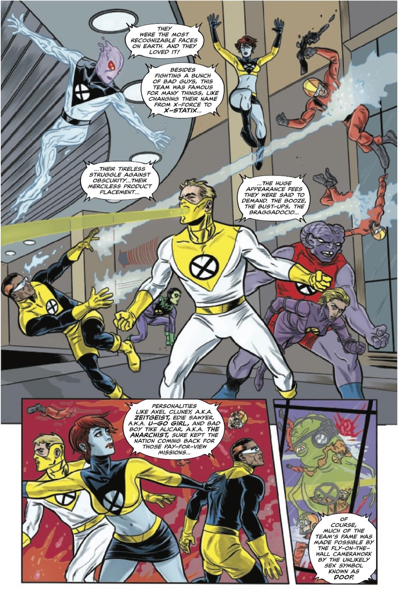 As is the case with the entire run of X-Statix, there is an aura of the unorthodox at work here that permeates the pages with a strangeness, an utter otherness that would make Grant Morrison smile. Milligan does a fabulous job of introducing new readers to the vivacious world of the X-Statix as well as bringing returning readers back up to speed without an exposition-heavy info dump of an issue. Far the flip from it, in fact this issue is completely new reader friendly while maintaining everything that made first time readers into loyal fans of the title. The story unfolds through the eyes of Katie Jones, once thought to be the younger sister of deceased team member, Edie Sawyer aka U-Go Girl we now find out that her connection to the former teleporter is drastically different and dramatically explosive. As the narrative begins, Katie is ,like most of the world, following the exploits of the X-Statix as a fan, especially where Edie Sawyer is concerned. Milligan’s dialog expertise takes center stage in this issue as he fills just about single word balloon with razor sharp quips, authentic sounding banter and just plain brilliant dialog. There is a relevance to the narrative that comes across via the social media and reality show aspects of the story. These elements have long been a part of the X-Statix backstory and Milligan does a fine job of upping the ante in those areas, bringing those elements up to date and into focus through the lens of 2019. The urgency of Katie Jones’ story is enhanced by not only her personal stakes, but by the team’s very real need for her to become one of them.