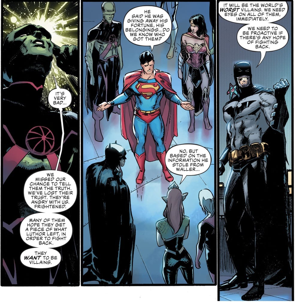 While Snyder’s writing takes center stage, this epic tale would not have been as perfectly orchestrated without James Tynion IV’s precise collaborative effort, particularly in wrapping up this chapter and launching the next. The two have a long history of exploring Gotham and the wider Bat-related worlds together. Their work on the New 52 title Talon was spun out of Snyder and Capullo’s epic “Court of Owls”arc. Tynion handles the Luthor-centric element of the issue in it Luthor casts the Justice League as failures and their attempt to keep the world safe has in fact placed it squarely in peril.