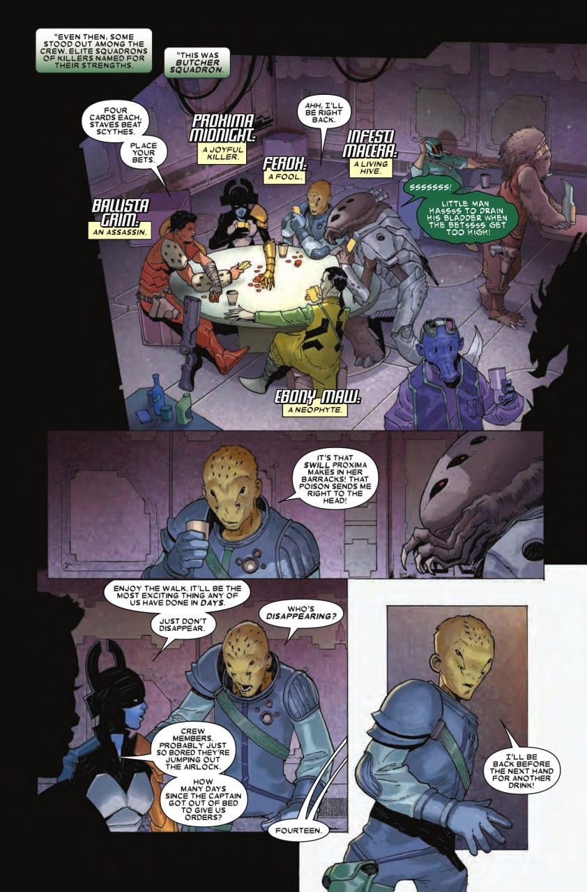 Howard goes to extreme lengths to show us a Thanos that we have not seen before, a multi-faceted character that is an obsessed lover, a military leader and ultimately a lethal enemy of life and destroyer of peace. We are getting in at the start of his Black Order, the sinister and fiercely loyal group of assassins that will go on to serve as Thanos’ elite personal mercenary unit. Howard shows her prowess as a brilliant storyteller, particularly adept at character driven narratives as she examines Thanos’ obsessive relationship with Death. She allows us to see Thanos through the eyes of his followers who see him as not only a strong leader, but as a guru of sorts, championing a philosophy of violence and dominance. In using Gamora as narrator Howard gives the narrative an emotional depth that might otherwise be diminished. There is a dark sensibility to her words, however Howard occasionally injects a bit of levity to keep the narration from becoming too heavy or morose. The dialog is likewise evenly balanced, containing just enough darkly comedic beats to keep the tone from becoming oppressive.
